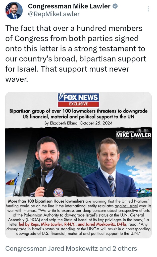 Lawler is one of the most bipartisan members of congress, drafting numerous pieces of legislation with a number of Democrats including Ritchie Torres (D-NY) and Josh Gottheimer (D-NJ). He has fought aggressively for his constituents and for actual peace in the Middle East. He has been ranked as a leader by the non-partisan group GovTracks.