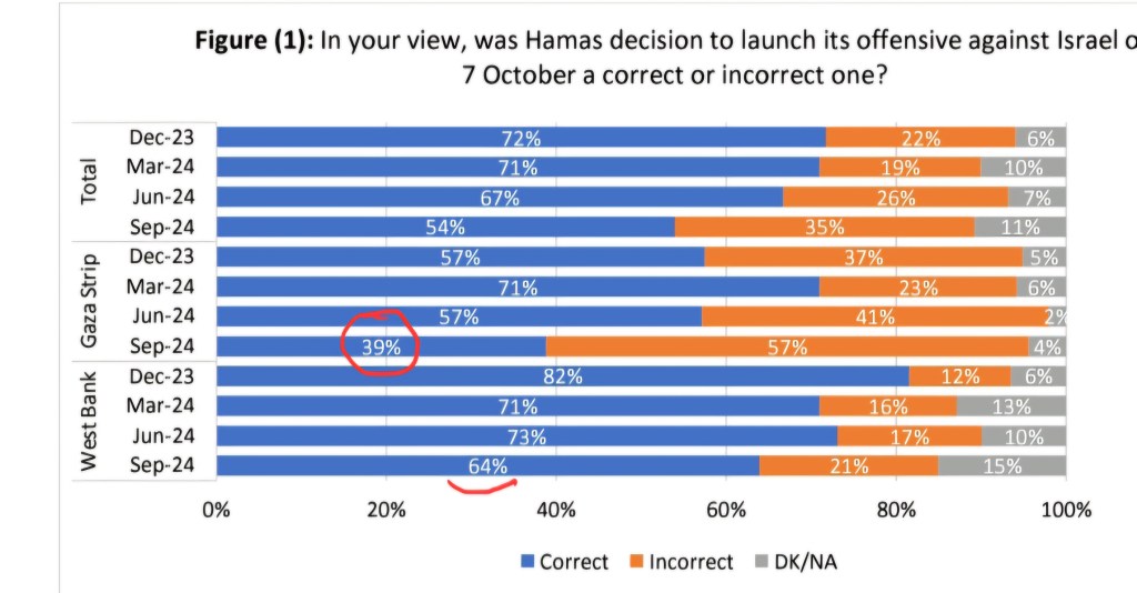 Similarly, Gazan support for the October 7 massacre dropped dramatically over the last six months from 71% to 39% as the war they initiated has become a dismal failure.