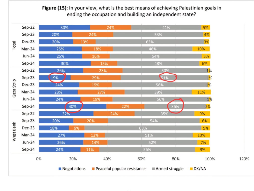 The poll does ask about the “best means of achieving Palestinian goals in ending the occupation and building an independent state,” which showed the majority of 56% of West Bankers still preferring violence to 36% in Gaza, a 20 point spread.