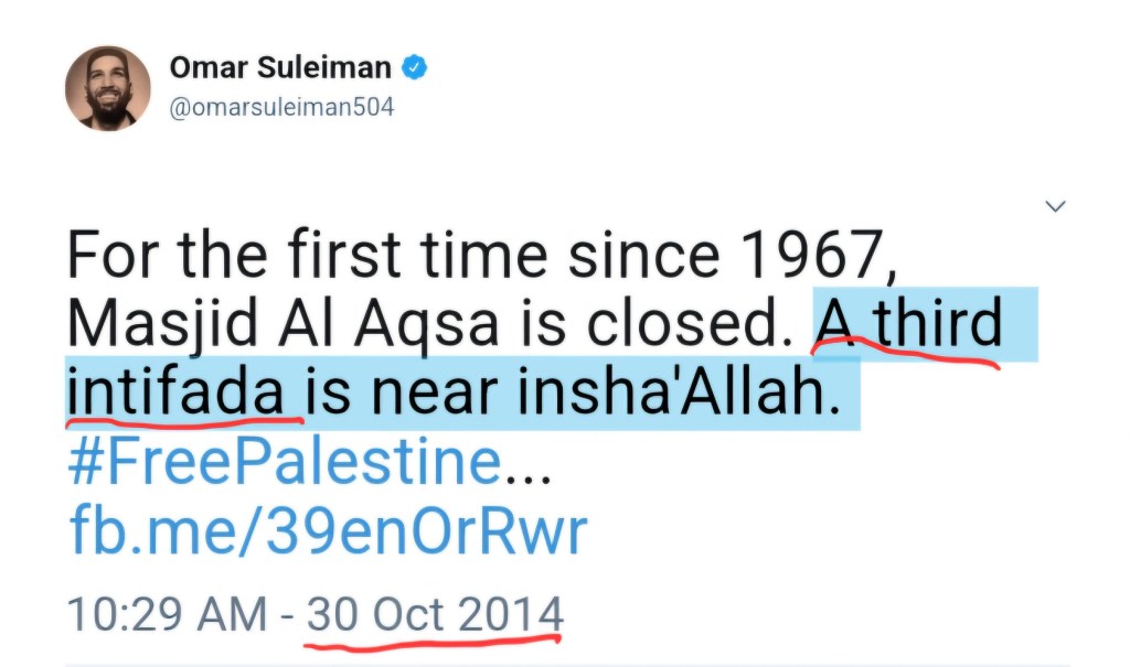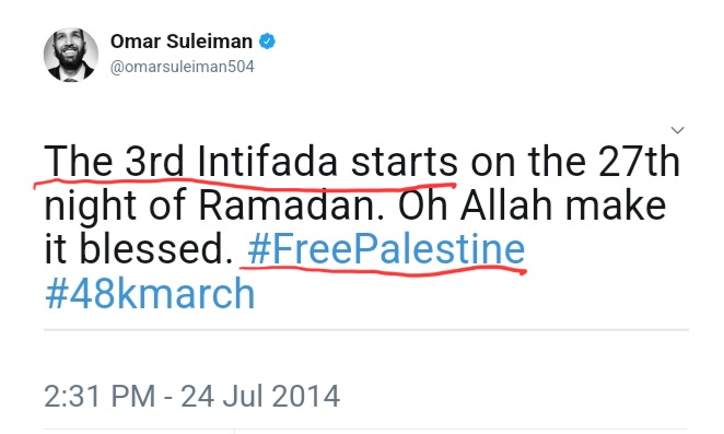 As the 2014 Israel-Hamas war started, Soleiman tweeted “The 3rd Intifada starts on the 27th night of Ramadan. Oh Allah make it blessed. #FreePalestine #48kmarch.” Just as the war was concluding, he tweeted much the same: “For the first time since 1967, Masjid Al Aqsa is closed. A third intifada is near insha’Allah #FreePalestine.”