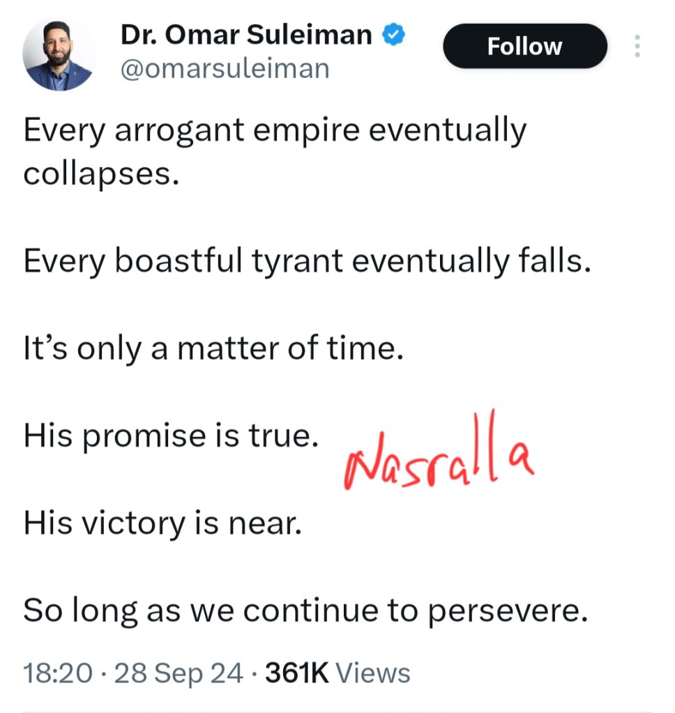 In the current Iranian proxies war against Israel, Suleiman continues to call for the destruction of Israel. After Hassan Nasrallah (fungus be upon him), the leader of the terrorist group Hezbollah was assassinated by Israel, Suleiman called to his followers to “continue to persevere” in the goal of eradicating the Jewish State.
