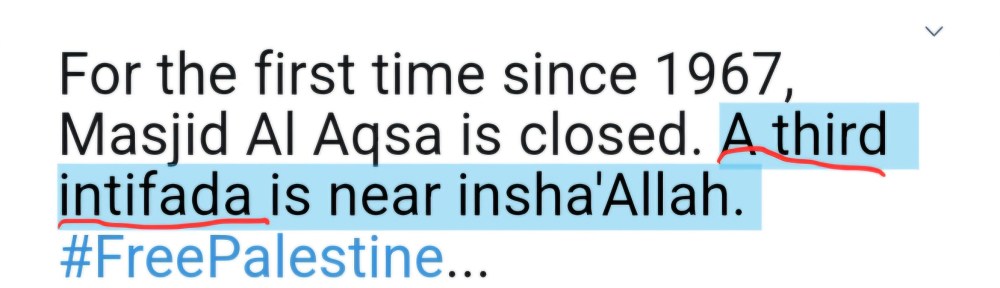 As the 2014 Israel-Hamas war started, Soleiman tweeted “The 3rd Intifada starts on the 27th night of Ramadan. Oh Allah make it blessed. #FreePalestine #48kmarch.” Just as the war was concluding, he tweeted much the same: “For the first time since 1967, Masjid Al Aqsa is closed. A third intifada is near insha’Allah #FreePalestine.”