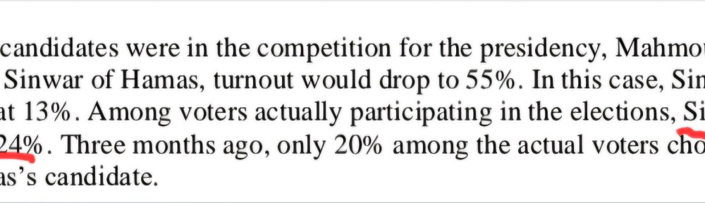 According to the September 2024 Palestinian Center for Policy and Survey Research (PCPSR) poll, Sinwar was much more popular than current head of the Palestinian Authority Mahmoud Abbas. In a head-to-head competition for the presidency, Sinwar would have trounced Abbas by 74% to 24%, a 50 point margin.