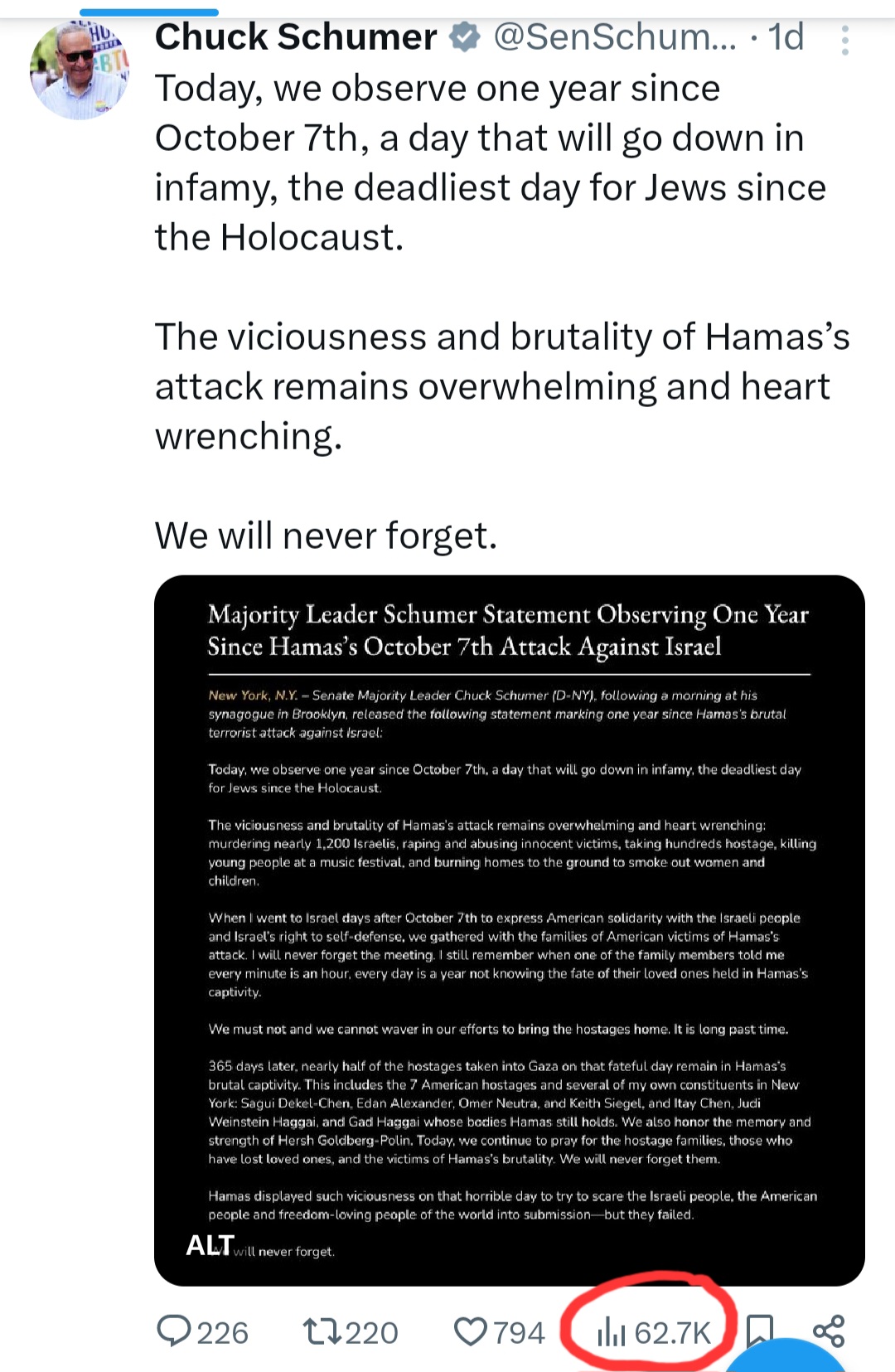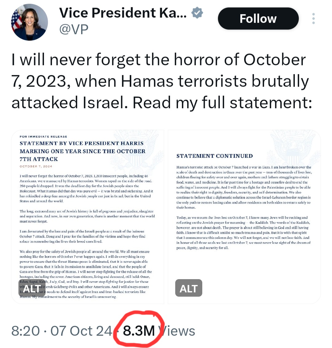 Vice President Kamala Harris’s post was viewed over 8 million times, or over 130 times more than Schumer. Her comments said that Hamas is a terrorist group that must never be allowed to govern Gaza. She spoke of standing with Israel and making sure it could defend itself against Iran and its proxies. She spoke of antisemitism.