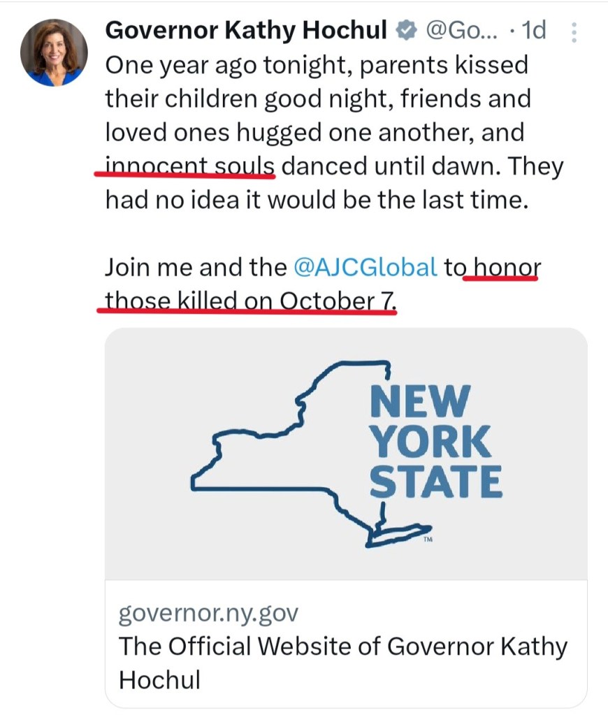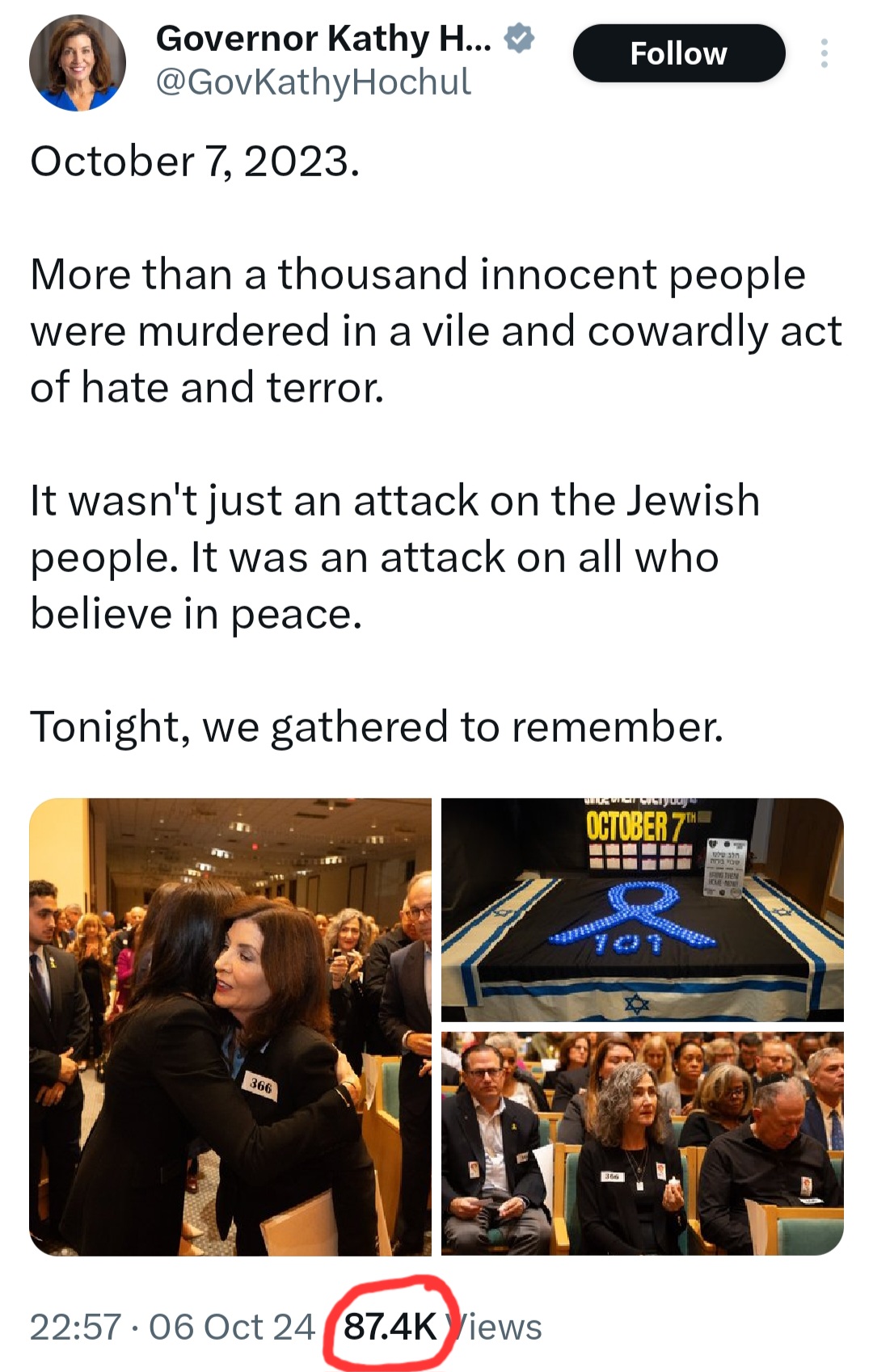 Compare that to New York State Governor Kathy Hochul who posted repeatedly on October 7.