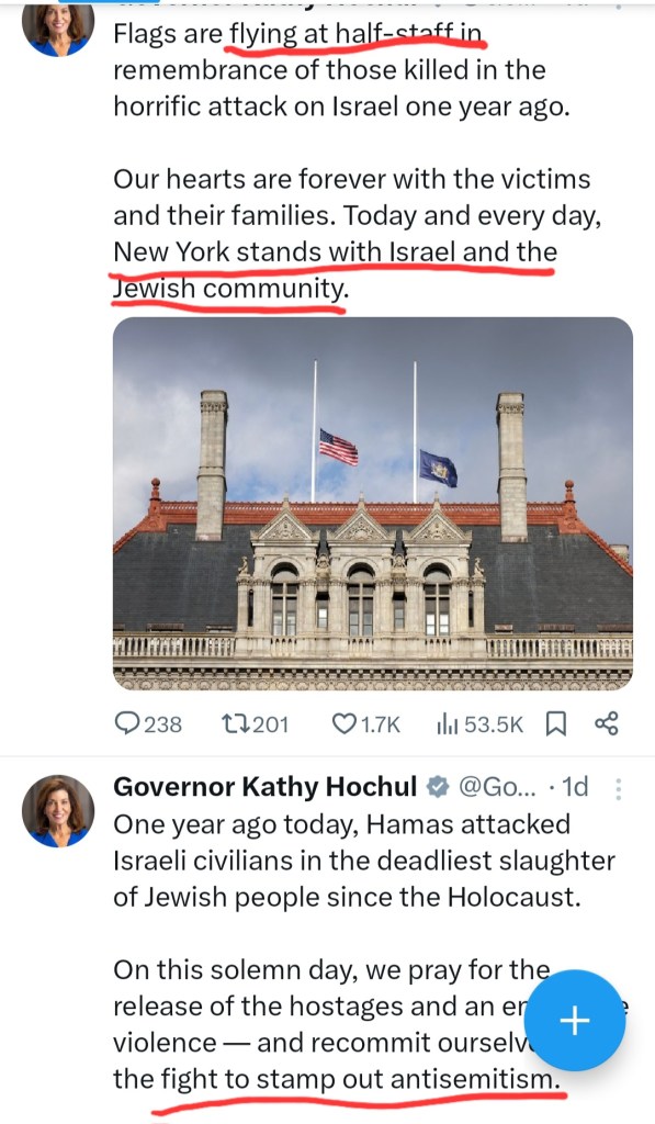 Hochul talked about fighting antisemitism. She said that New York stood with Israel. She ordered flags to fly at half-mast to remember the massacred Israelis. She spoke about peace, all in several posts viewed much more than the Jewish Senate Majority Leader.