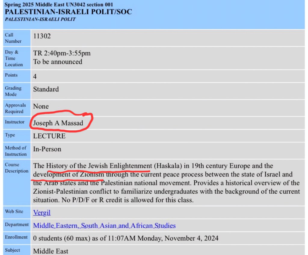 University professors are granted tenure and cannot be fired unless there are particularly outrageous actions. Knowing this, people like Columbia professor Joseph Massad tells students that the Jews in the Bible are actually “Palestinian Hebrews.” He shared his feelings of “jubilation and awe” about the October 7 massacre of 1,200 people in Israel. He and other professors routinely hold classes that Jews have no history in the holy land and are engaged in a project of “European Settler Colonialism.“