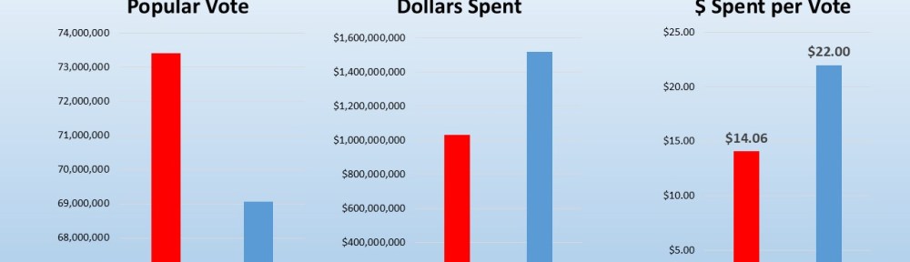 Trump won roughly 4.5 million more votes than VP Kamala Harris. According to Open Secrets, Trump spent about one-third less than Harris on the campaign, about $1.0 billion to $1.5 billion for Harris. Taken together, Harris spent $22.00 on average per vote compared to Trump’s spend of about $14.06, 56% more.