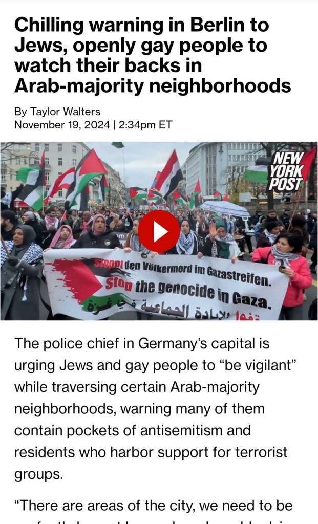Berlin, Germany’s top cop, Barbara Slowik, issued a warning to Jews and gay people, “There are areas of the city, we need to be perfectly honest here, where I would advise people who wear a kippah or are openly gay to be more careful.” She added “There are certain neighborhoods where the majority of people of Arab origin live, who also have sympathies for terrorist groups.”