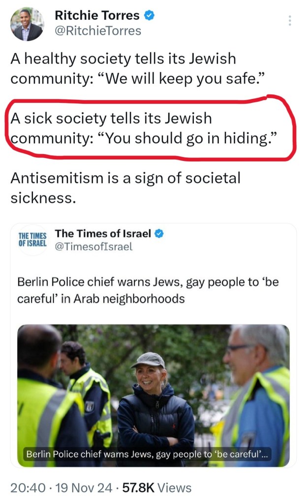 New York’s Rep. Ritchie Torres (D-NY) was outraged by the warning. He said “A healthy society tells its Jewish community: “We will keep you safe.” A sick society tells its Jewish community: “You should go in hiding.” Antisemitism is a sign of societal sickness.”