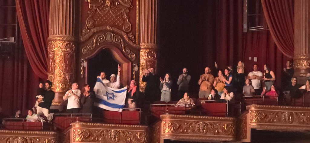 The show was definitely charged with Israeli energy. In the lobby of the concert hall, people from the Israeli American Council were getting people to sign onto the World Zionist Congress election to vote for the IAC slate. People in the crowd carried Israeli flags. Almost the entirety of the concert was in Hebrew.