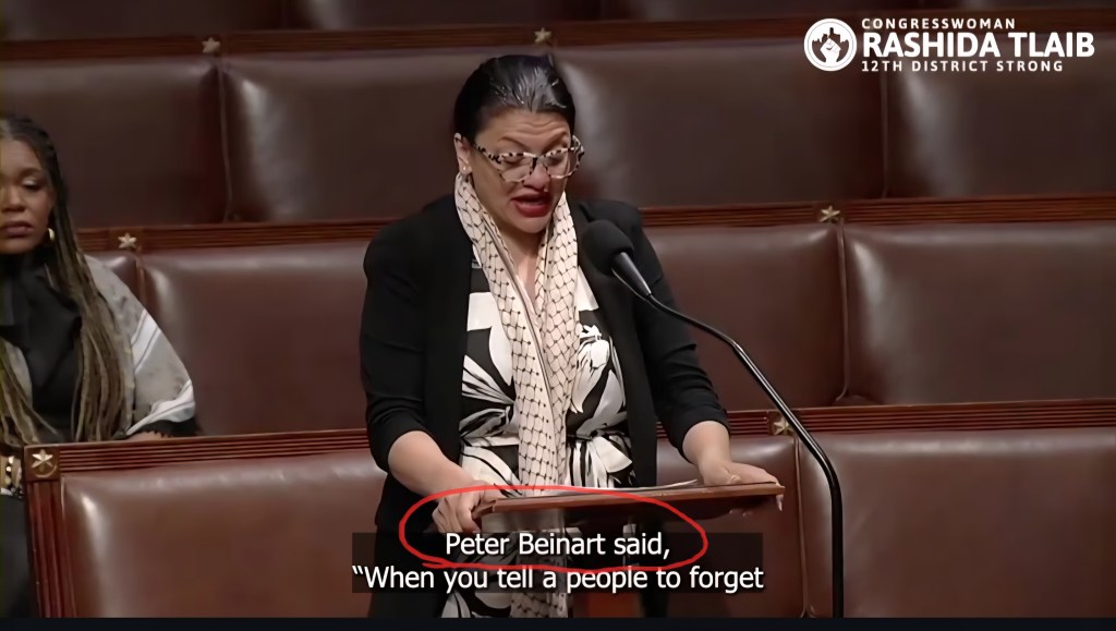 When she stood in Congress on Israel’s May 14 Independence Day to introduce an “Ongoing Nakba” resolution because the State of Israel continues to exist, she decided to open by quoting Peter “AsAJew” Beinart.