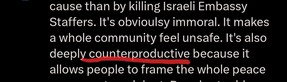 This mode of thinking belongs to a form of strategic utilitarianism—actions are weighed not on whether they are ethically sound, but whether they are instrumentally successful. Murder isn’t condemned for its cruelty or injustice, but for its inefficiency. Protest isn’t wrong because it defies norms, but because it alienates potential allies or invites political backlash as in: it “provide[s] the Trump Administration with ammunition…” and “it allows people to frame the whole peace movement as violent.”