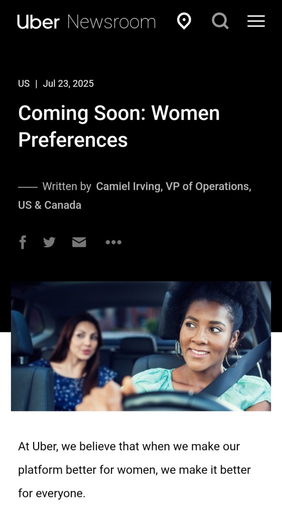 Uber, the global ride-hailing behemoth, has quietly introduced a service in various markets that allows female drivers to opt into picking up only female passengers. It’s being billed as a safety measure—one that empowers women to feel more comfortable driving and riding in liberal cities of Los Angeles, San Francisco and Detroit. But let’s not miss the forest for the trees: this is gender-based discrimination, plain and simple. A man hailing a ride and seeing it canceled because the driver opted for a woman-only ride is, quite literally, being excluded based on sex.