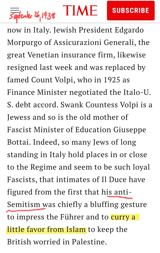 At the time, Time magazine cynically suggested Mussolini might be “bluffing,” seeking to please Hitler and “curry favor with Islam” in Palestine. Antisemitism, in this view, was not only about Jews—it was also geopolitical currency, among his people and traded to win influence with the Muslim world.