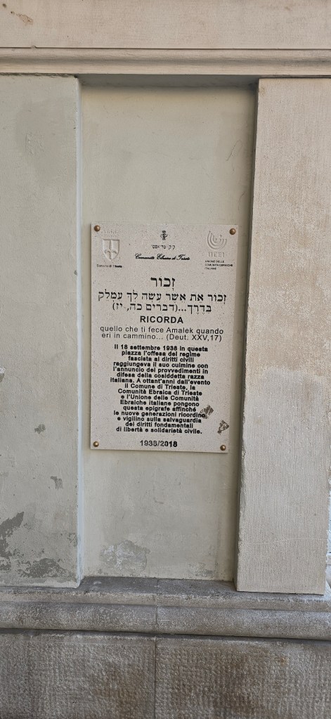 There, in the quiet underbelly of the central building’s portico, a plaque catches the eye. In large Hebrew letters: “Zachor”—Remember. A verse from the Torah commands the Jewish people for all generations to recall what Amalek did—attacking the weak and stragglers as the Israelites left Egypt. Beneath the Hebrew, the Italian inscription explains: this was the site where Benito Mussolini, in September 1938, delivered his edict of the “Racial Laws.” In his speech, Mussolini declared Jews “incompatible” with Fascist Italy and announced their expulsion from national life.
