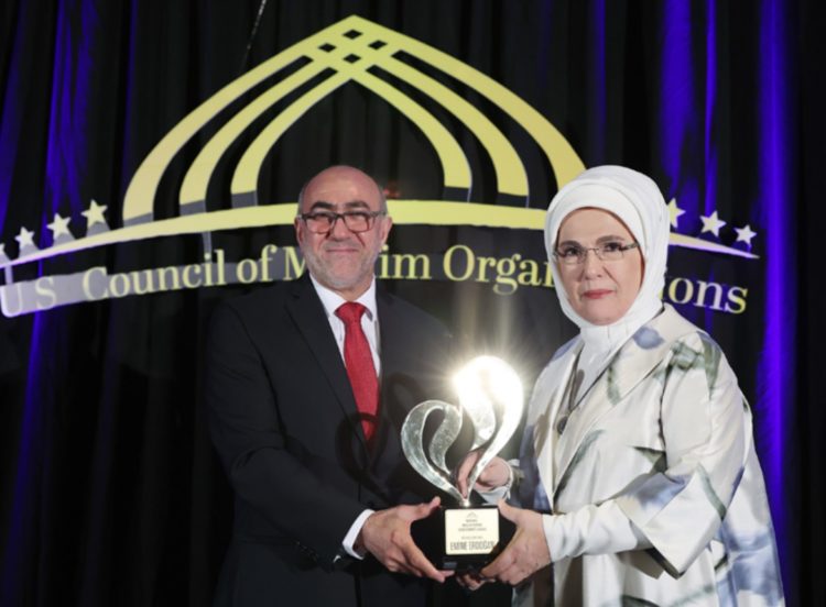 Turkey’s first lady, Emine Erdogan, was recognized with an award by the US Council of Muslim Organizations (USCMO) in New York in 2022. The award was personally delivered by Ousama Jammal, a key Muslim Brotherhood figure in the US. USCMO has been accused of ties to the Muslim Brotherhood.