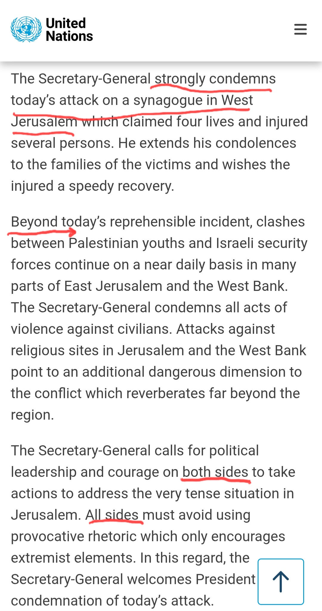 In 2014, after Arab terrorists entered a synagogue in Jerusalem wielding meat cleavers and hacked Jewish worshippers to death, Ban Ki-moon issued a statement that follows the exact same structure.