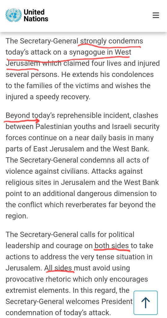 Instead, Ban Ki-moon calls for leadership on “both sides”, urges all parties to avoid “provocative rhetoric,” and frames the slaughter of Jews in a synagogue as a destabilizing dimension of the conflict—not as terrorism demanding elimination.