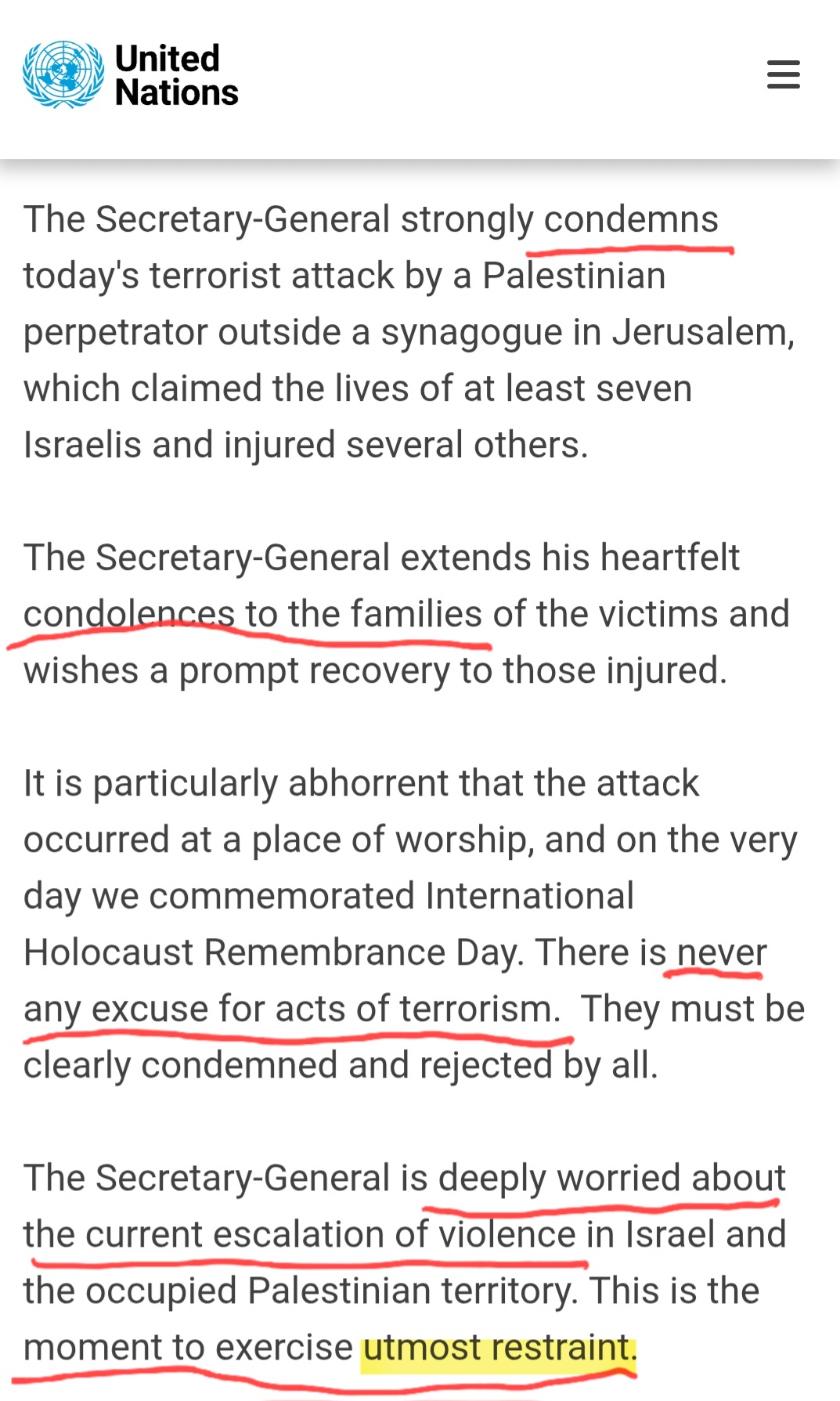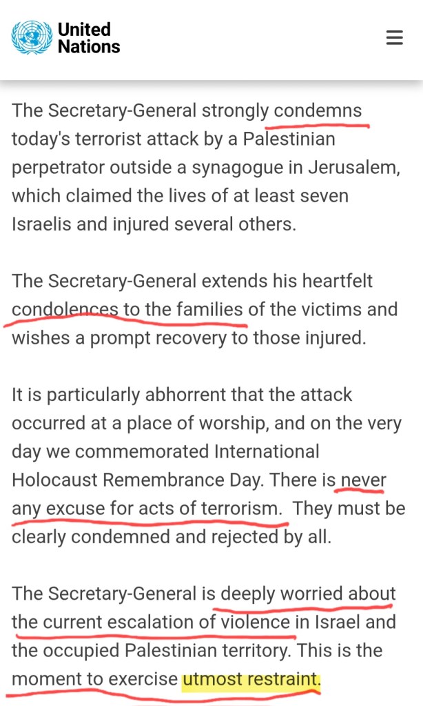 Yet in Jerusalem, when Jews are murdered outside a synagogue in 2023—on International Holocaust Remembrance Day- a whisper. The Secretary-General “strongly condemns” the attack. He offers condolences. He notes that it is abhorrent to attack a place of worship. And then he pivots—not to justice, not to accountability, not to solidarity with the state charged with protecting its citizens.