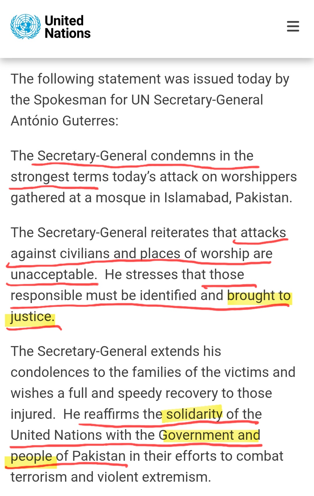 In Pakistan, the Secretary-General “condemns in the strongest terms” the attack on worshippers. He demands that the perpetrators be “identified and brought to justice.” He affirms the “solidarity of the United Nations with the Government and people of Pakistan” and situates the crime squarely within the global fight against terrorism and violent extremism.