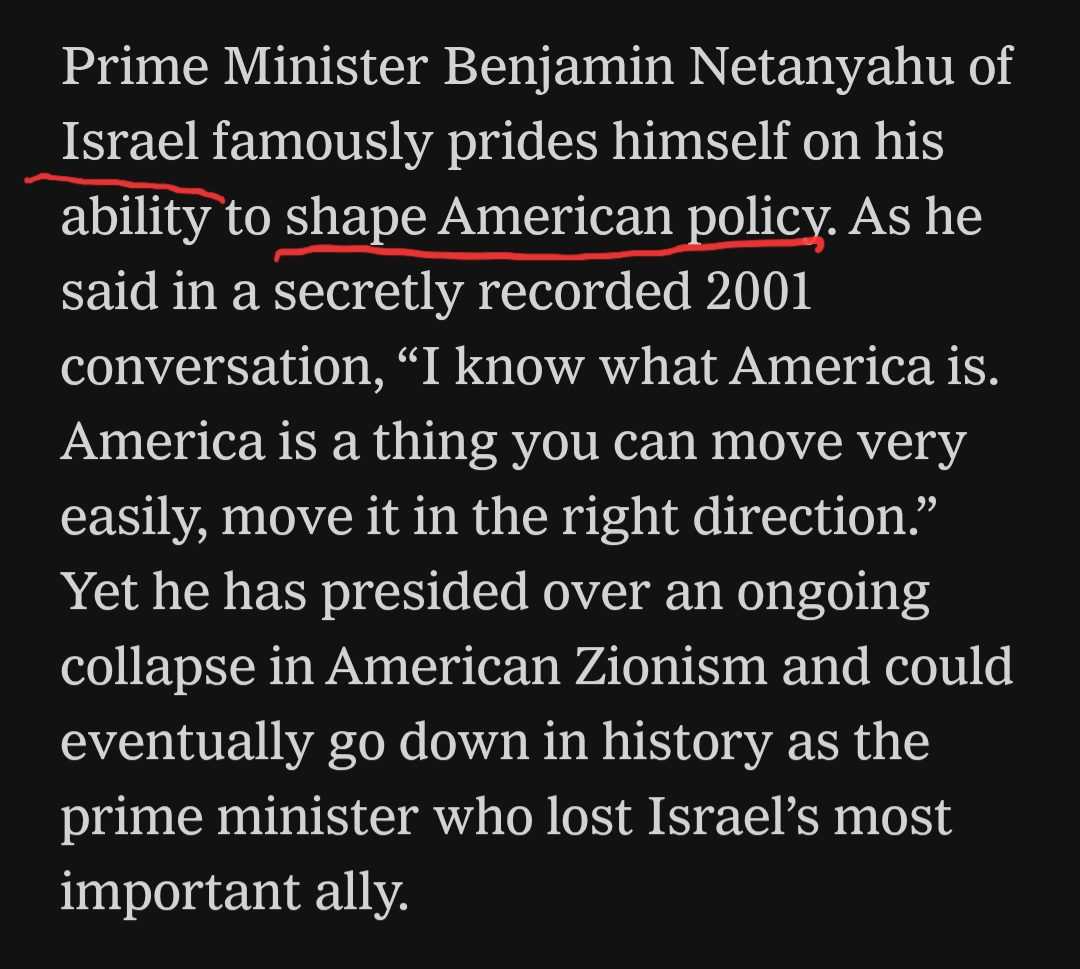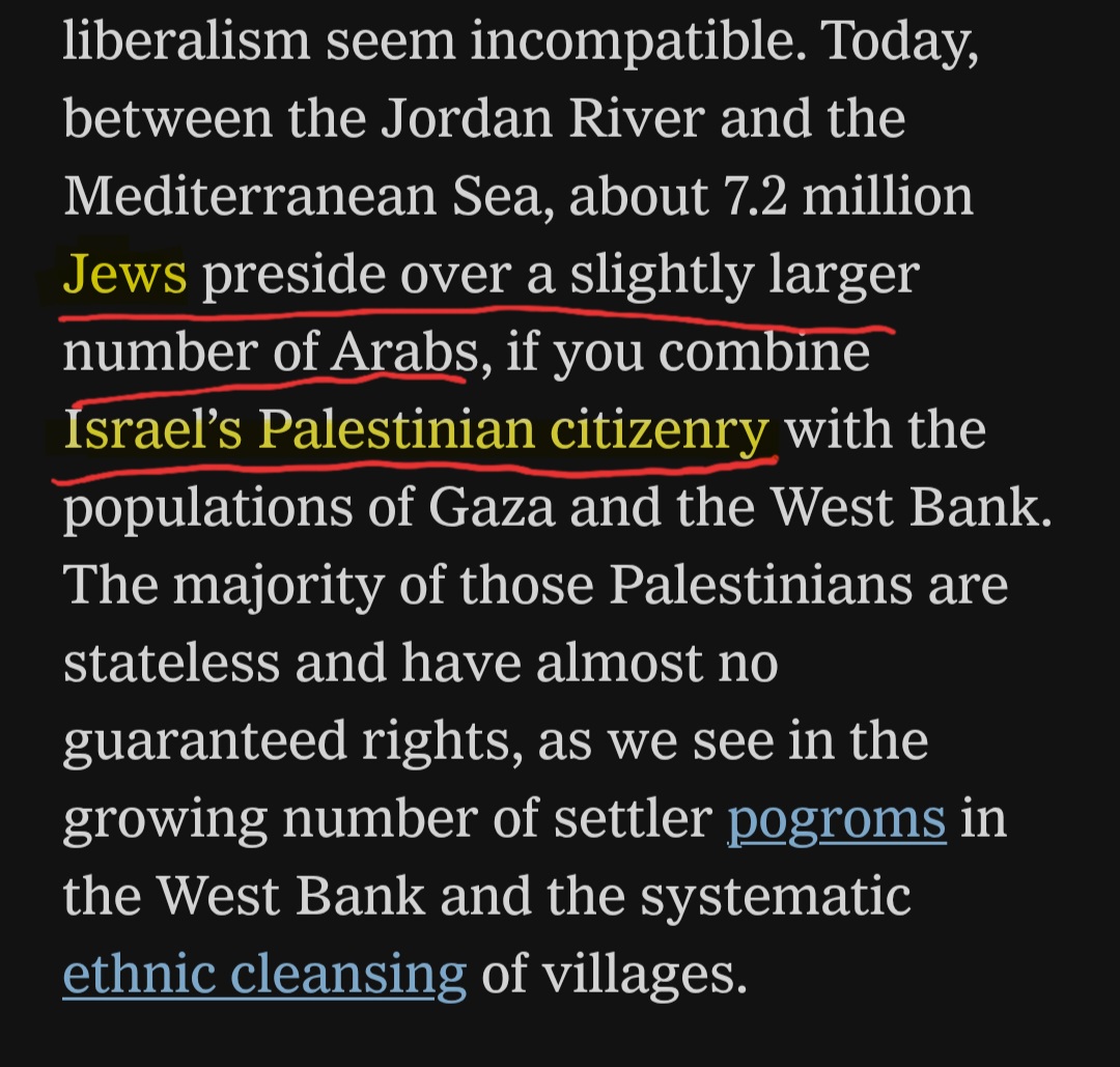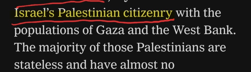 Israelis are discussed in ways readers instinctively map onto Jews. Israeli Arabs are transformed into “Israel’s Palestinian citizenry”, separating them rhetorically from the category of “Israelis.” Roughly a quarter of Israel’s citizens are not Jewish, yet that demographic fact disappears from the frame. Israeli Arabs are no longer part of the “Israel” that is “losing America” because they are really part of the counterparty in the war. That means that only Israeli Jews are the problem. The contrast is especially stark as the world cannot conceive of a “Palestinian Jew.”