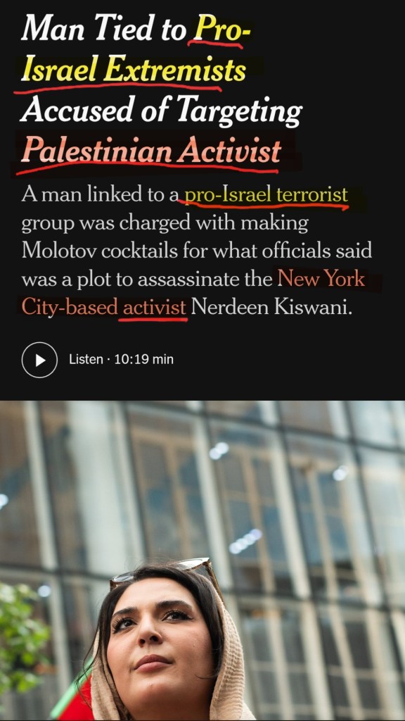 The reality is that a pro-Israel “extremist” allegedly planned an attack on a pro-Palestinian “extremist.” But the Times editorialized by showing the smiling face of an “activist” worried about the “suffering” of her people. Such is the alt-left embrace of the toxic “deformity in Palestinian culture.”