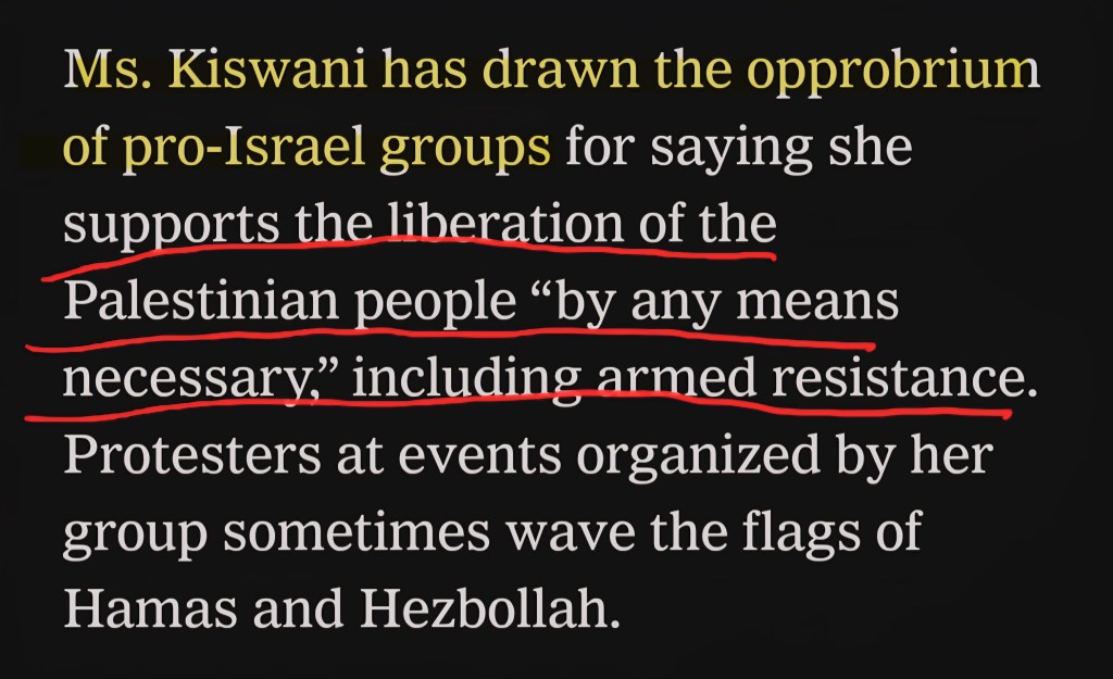Why did the Times make it sound like pro-Israel groups were uniquely offended that “she supports the liberation of the Palestinian people “by any means necessary,” including armed resistance.”?