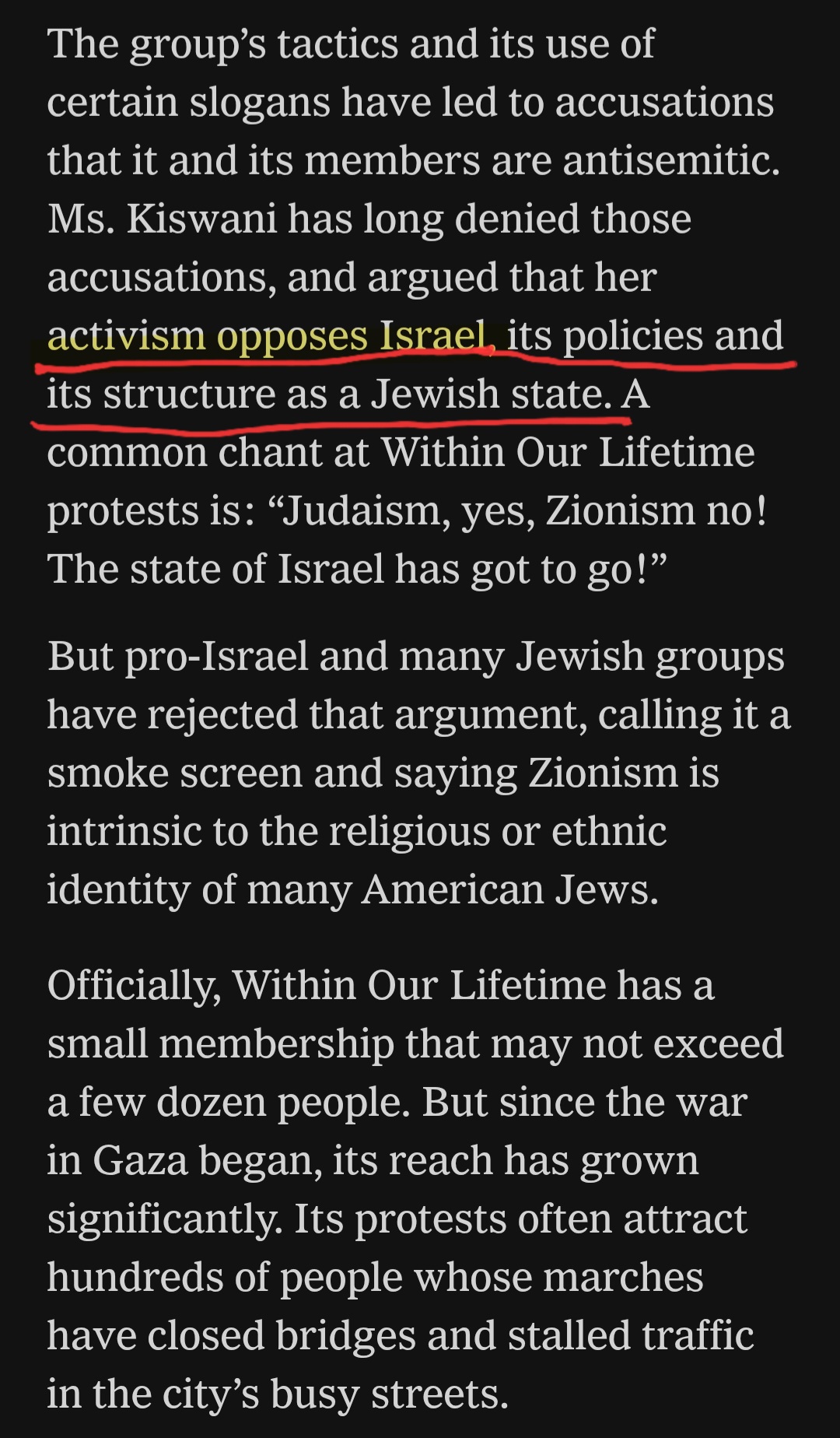 Why did the Times use so much energy and so many words to say “that her activism opposes Israel, its policies and its structure as a Jewish State,” without saying that she supports targeting Jewish organizations and the annihilation of the only Jewish State?