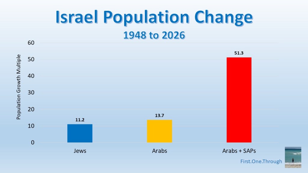 Put into historical perspective, the scale becomes even sharper. In 1948, Israel’s Arab population stood at roughly 156,000. By 2026, it had already grown to more than 2.1 million, more than thirteenfold growth, already exceeding Jewish proportional growth over the same period. Add 5.9 million more, and that Arab population would stand at more than 8 million, representing more than fiftyfold growth since the founding of the state.