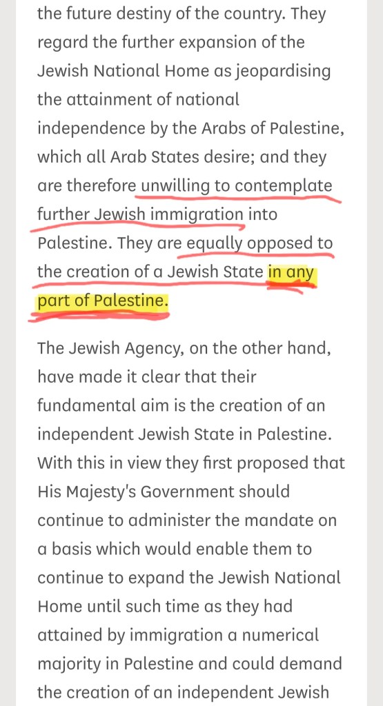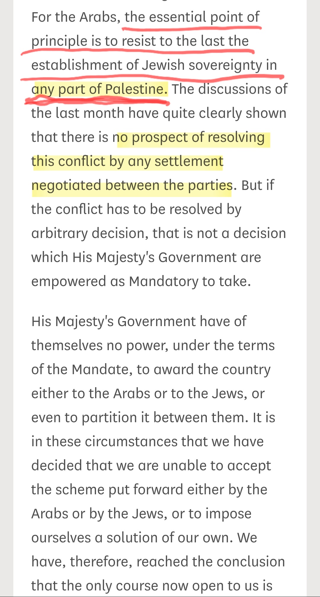 Again, he made the position clear that “for the Arabs, the essential point of principle is to resist to the last the establishment of Jewish sovereignty in any part of Palestine.” He saw “no prospect of resolving this conflict by [negotiated] settlement,” consequentially leading to persistent violence. The competing demands of the Arabs and Jews made the situation “irreconcilable.”