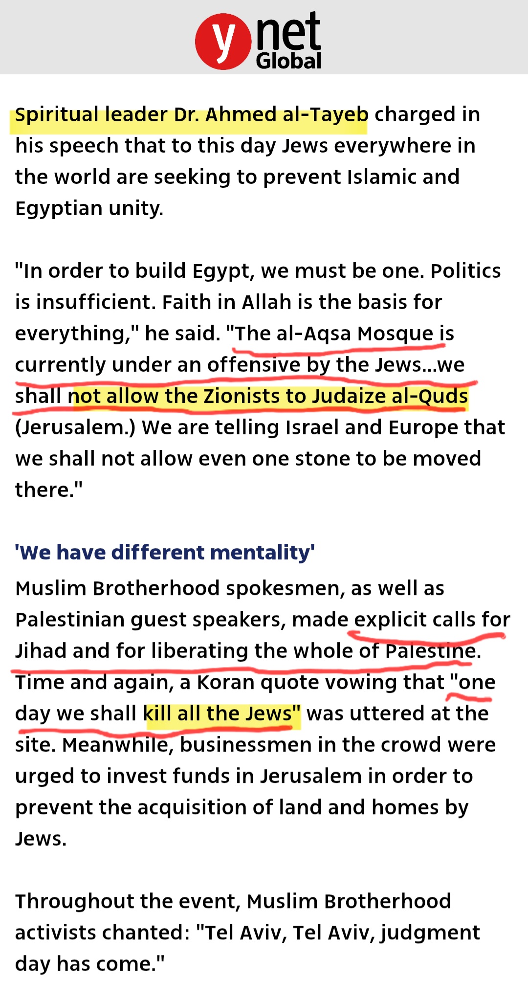 “”Do not think that we will ever give up on Jerusalem. We cannot abandon our rights there as a Muslim people. Allah will not enable you to erect a single stone on this land as long as Jihad persists.”” – official statement of Al-Azhar