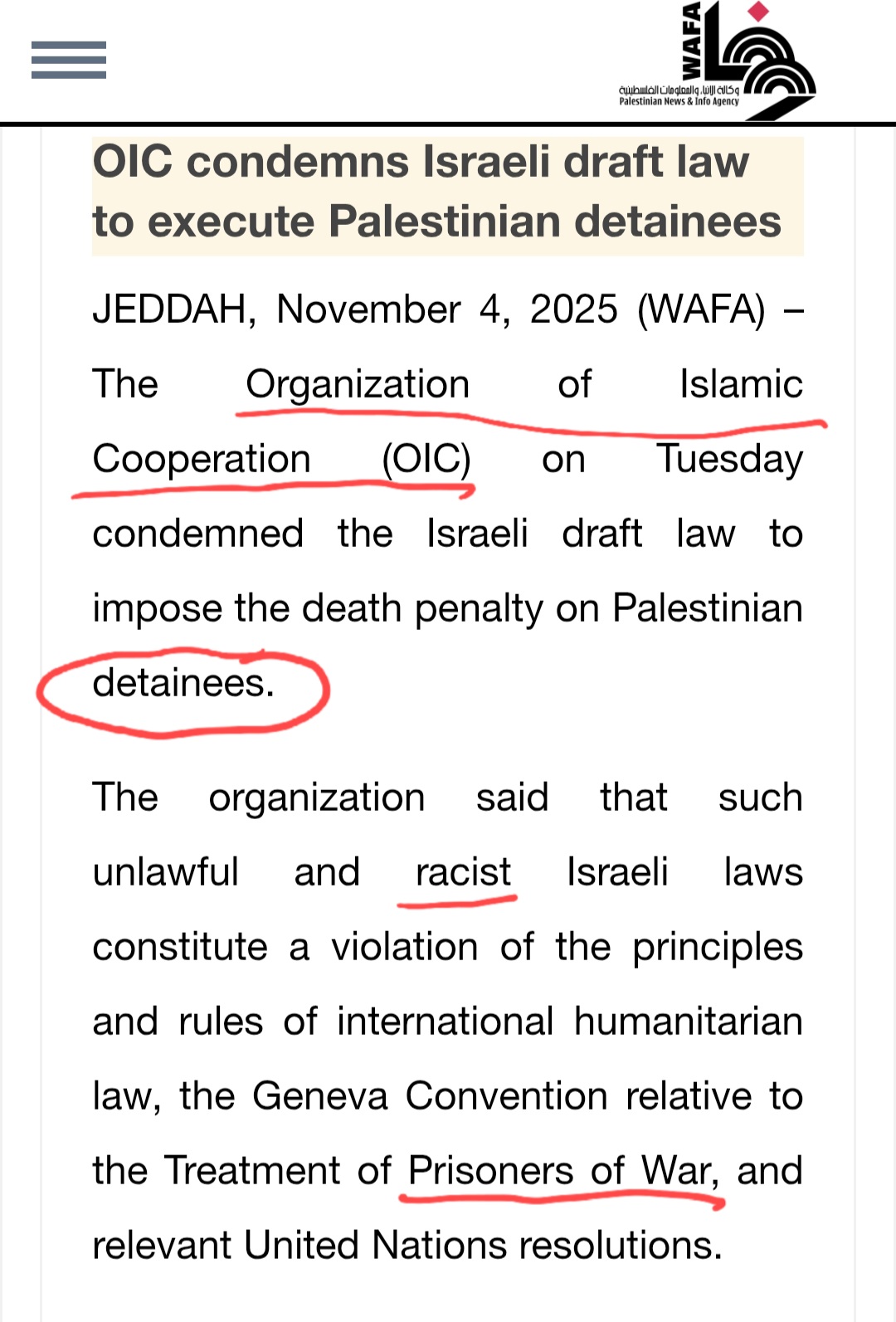 Wafa report on OIC condemning Israel for considering death penalty for Palestinian “detainees”