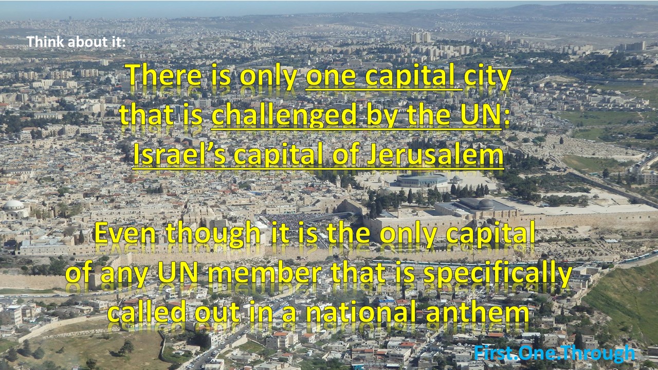Think about it: Israel’s national anthem is uniquely about its eternal capital of Jerusalem, and it’s the only capital under assault at the UN.