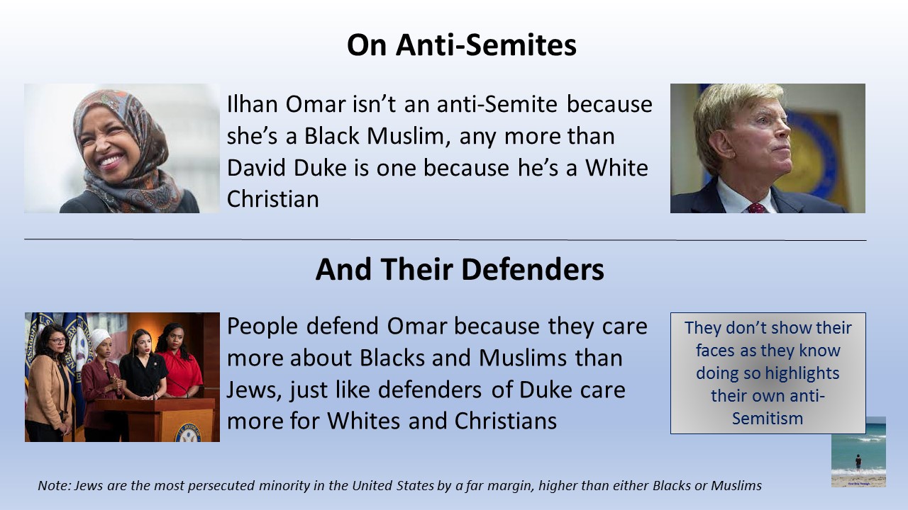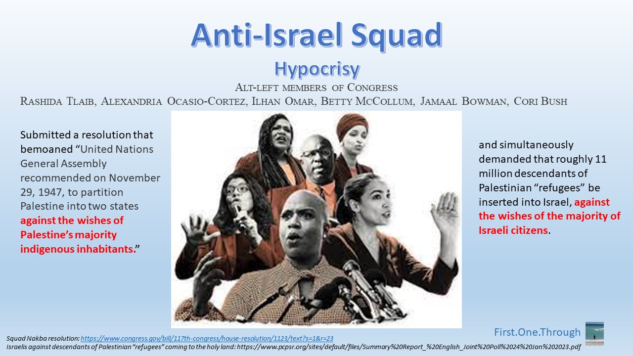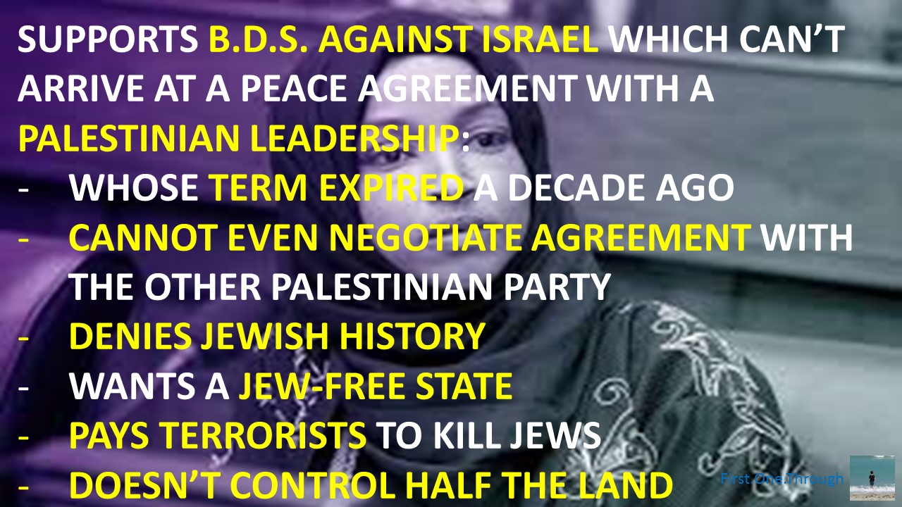 New Alt-Left Congresswoman Ilhan Omar supports BDS of Israel because it cannot negotiate peace with a terrorist-supporting, Holocaust-denying, anti-Semitic, corrupt, unpopular Palestinian leadership whose term expired over a decade ago.