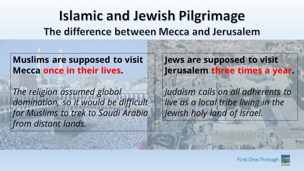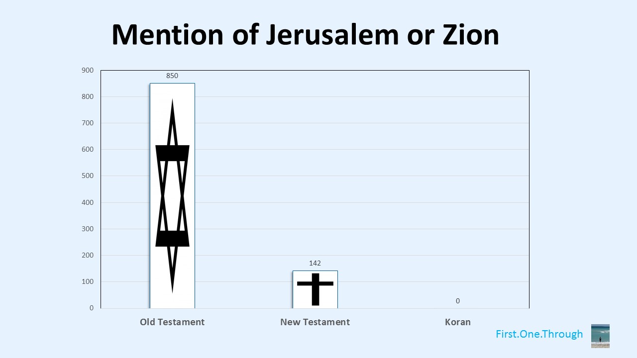 Jerusalem is mentioned throughout the Jewish bible, in contrast to never being mentioned in the Islamic Koran.
