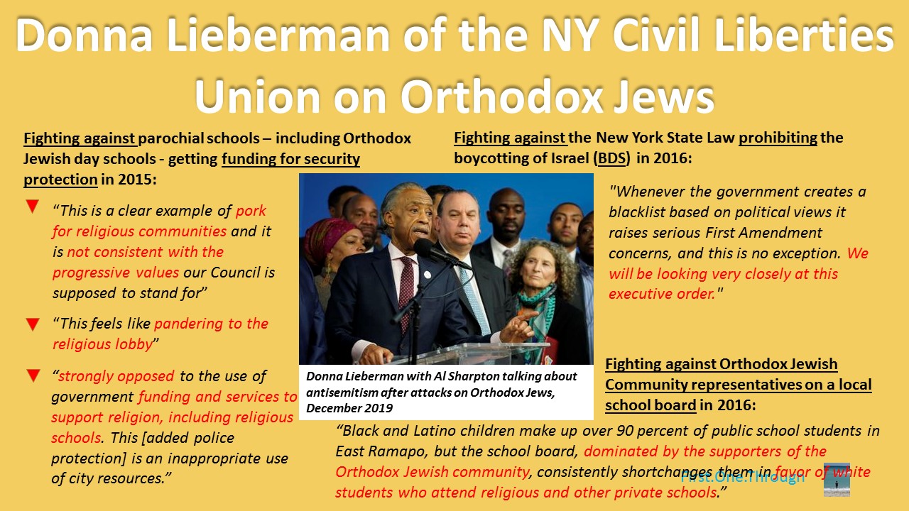 Donna Lieberman of the NY Civil Liberties Union took the stage with Rev. Al Sharpton yesterday to discuss antisemitism after several attacks against the Orthodox Jewish community, a community she has fought against repeatedly over the past several years.