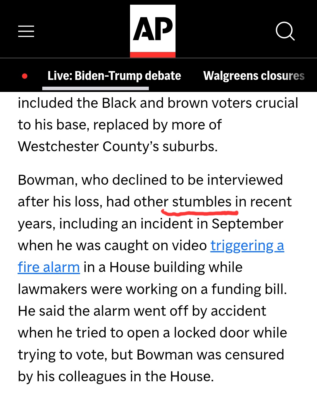 The Associated Press said that Bowman had “stumbles” portraying his actions as accidental, such as pulling the fire alarm, even though videos show that he did it on purpose.