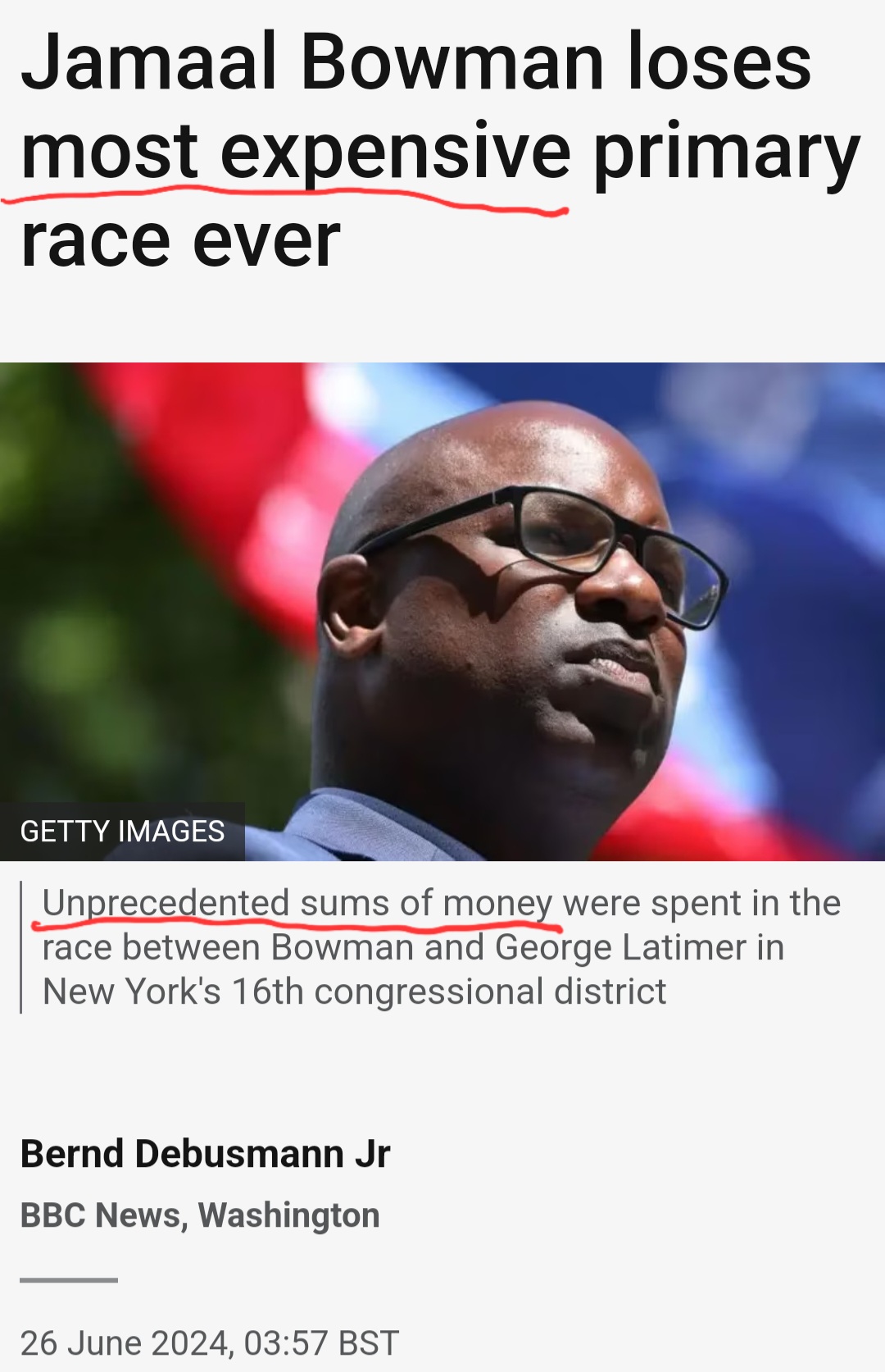 On June 4, 2024, Bowman, a frequently invited guest on MSNBC, slammed his progressive primary opponent as a MAGA Republican out to destroy democracy, when Latimer actually has 35 years of liberal bona fide legislative history. Rather than correct Bowman for the audience, the hosts at MSNBC said “we need more time with him.”