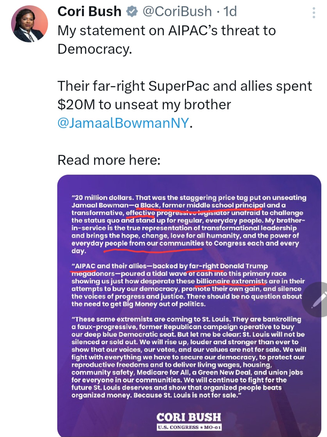 “AIPAC and their Republican billionaires are spending millions to try to buy our district… their money will never defeat the people.”