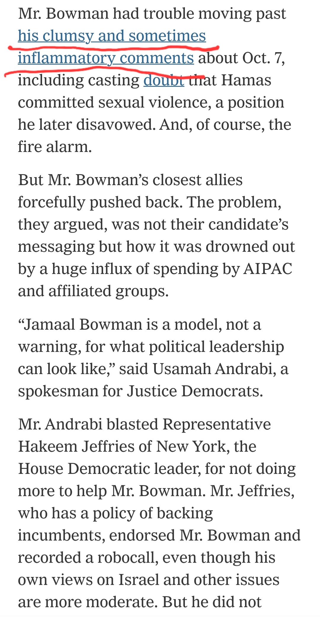So when the polls closed on June 25, and the obvious became public, The New York Times didn’t talk about the censured eak politician who never got to know his constituents, and instead blamed Bowman’s demise on a “flood of pro-Israel money.”