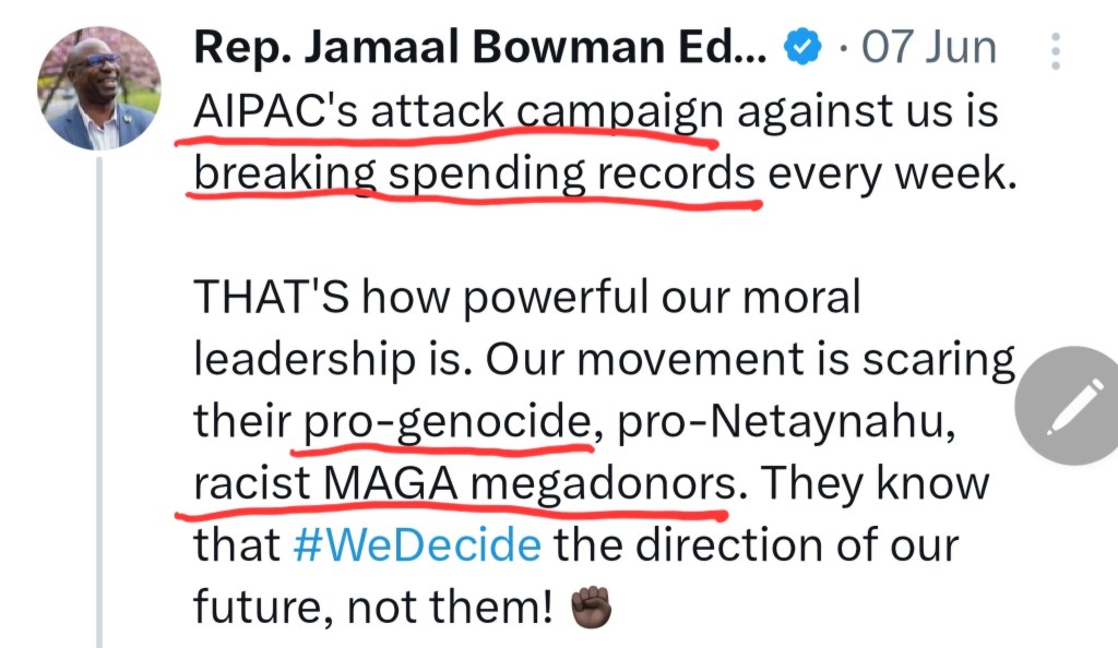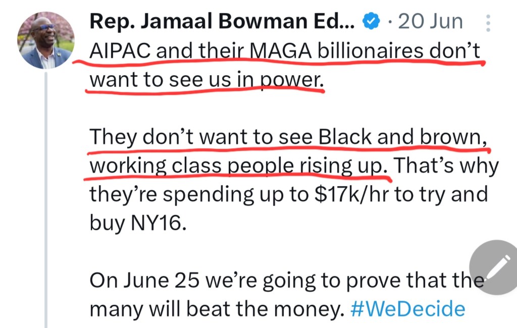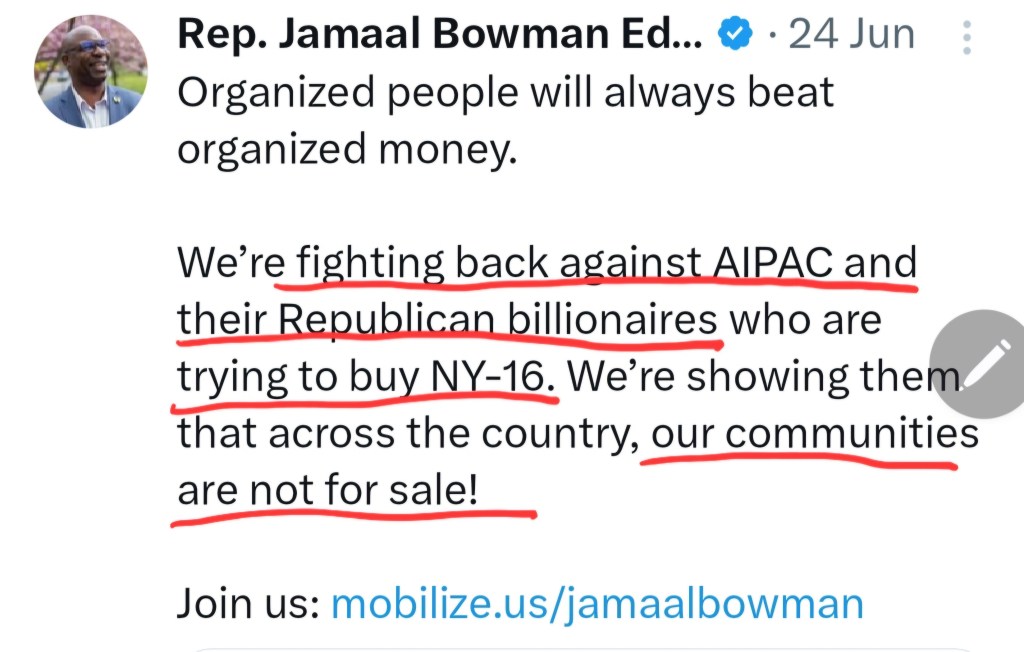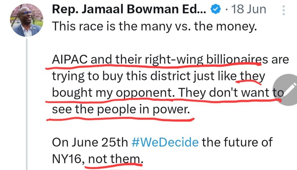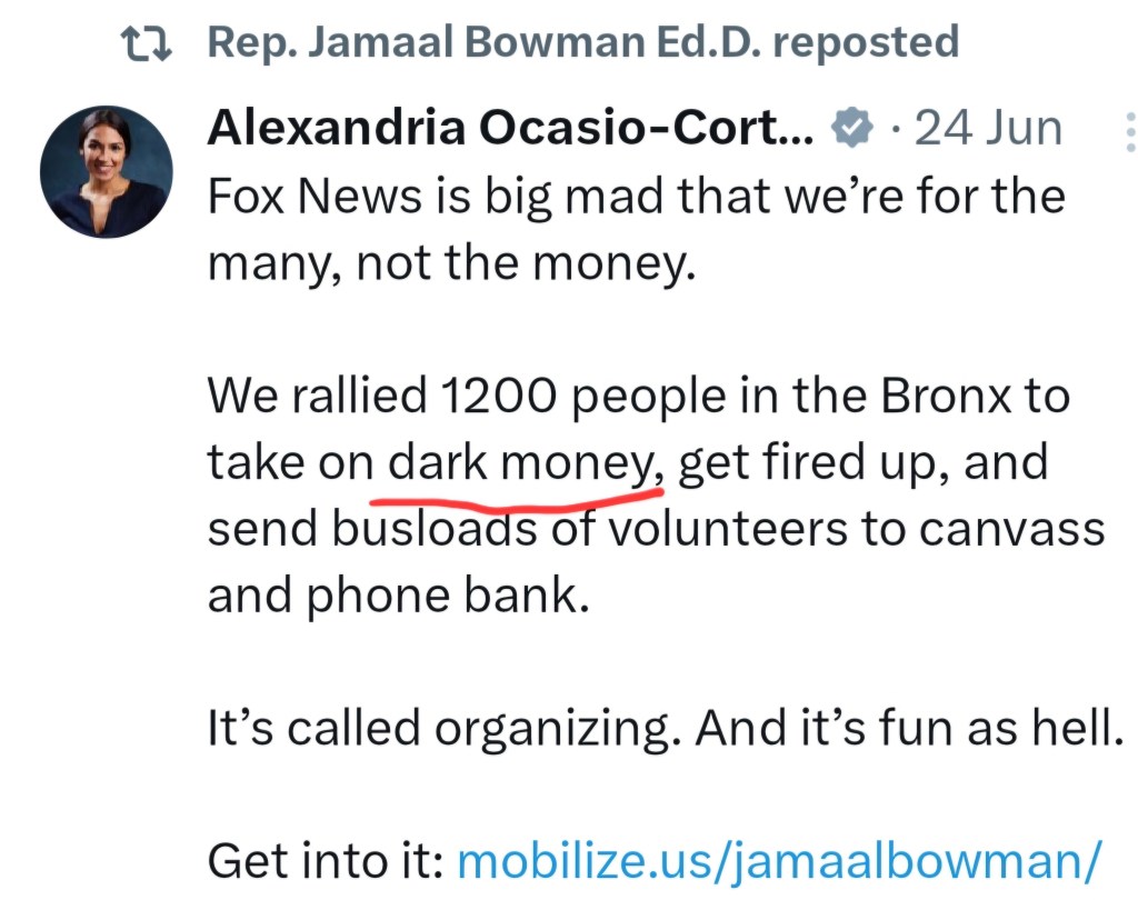 “Dark money has spent the largest sum in history to unseat Jamaal Bowman… these lobbies don’t care about the Bronx and Westchester.”