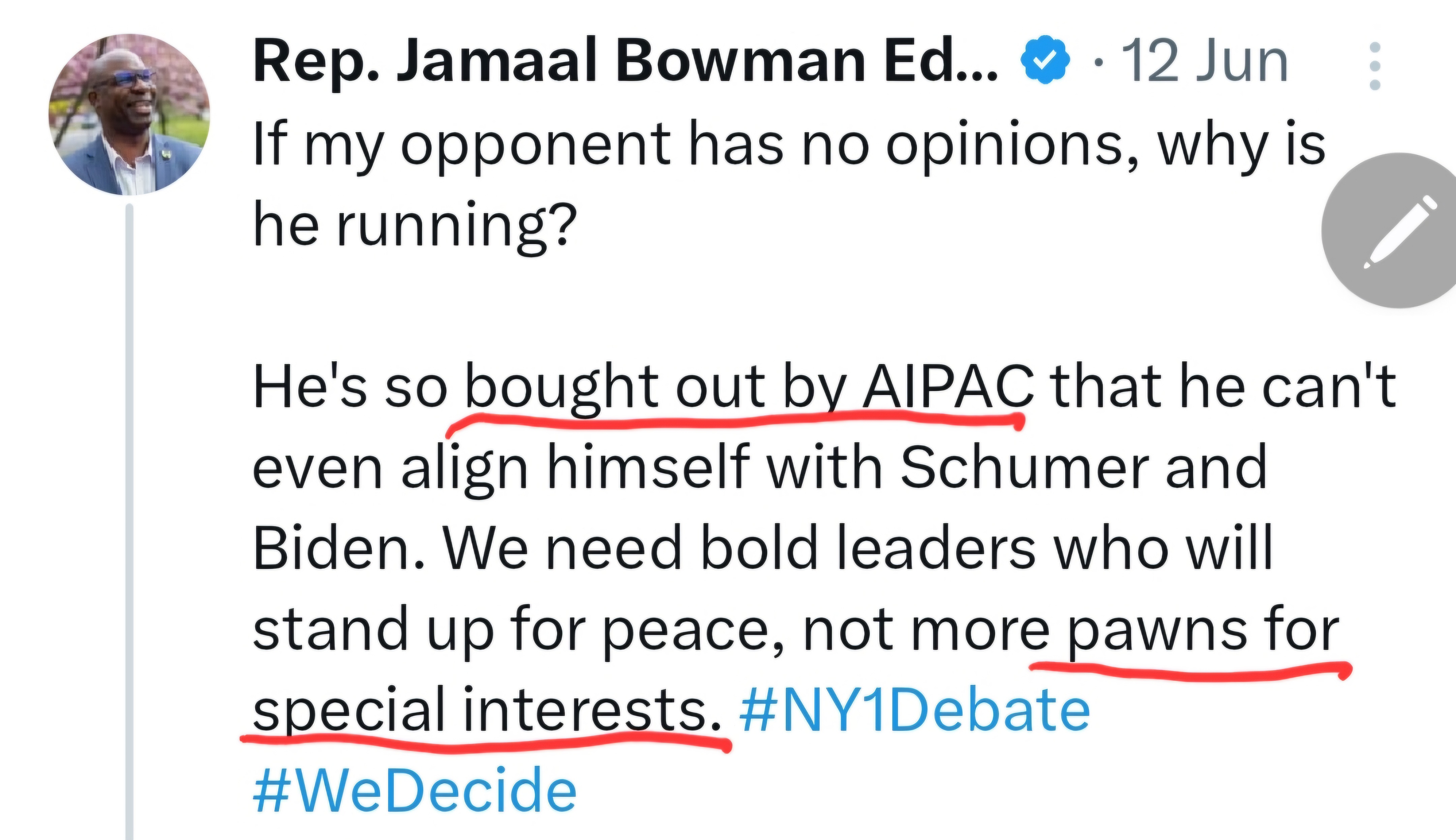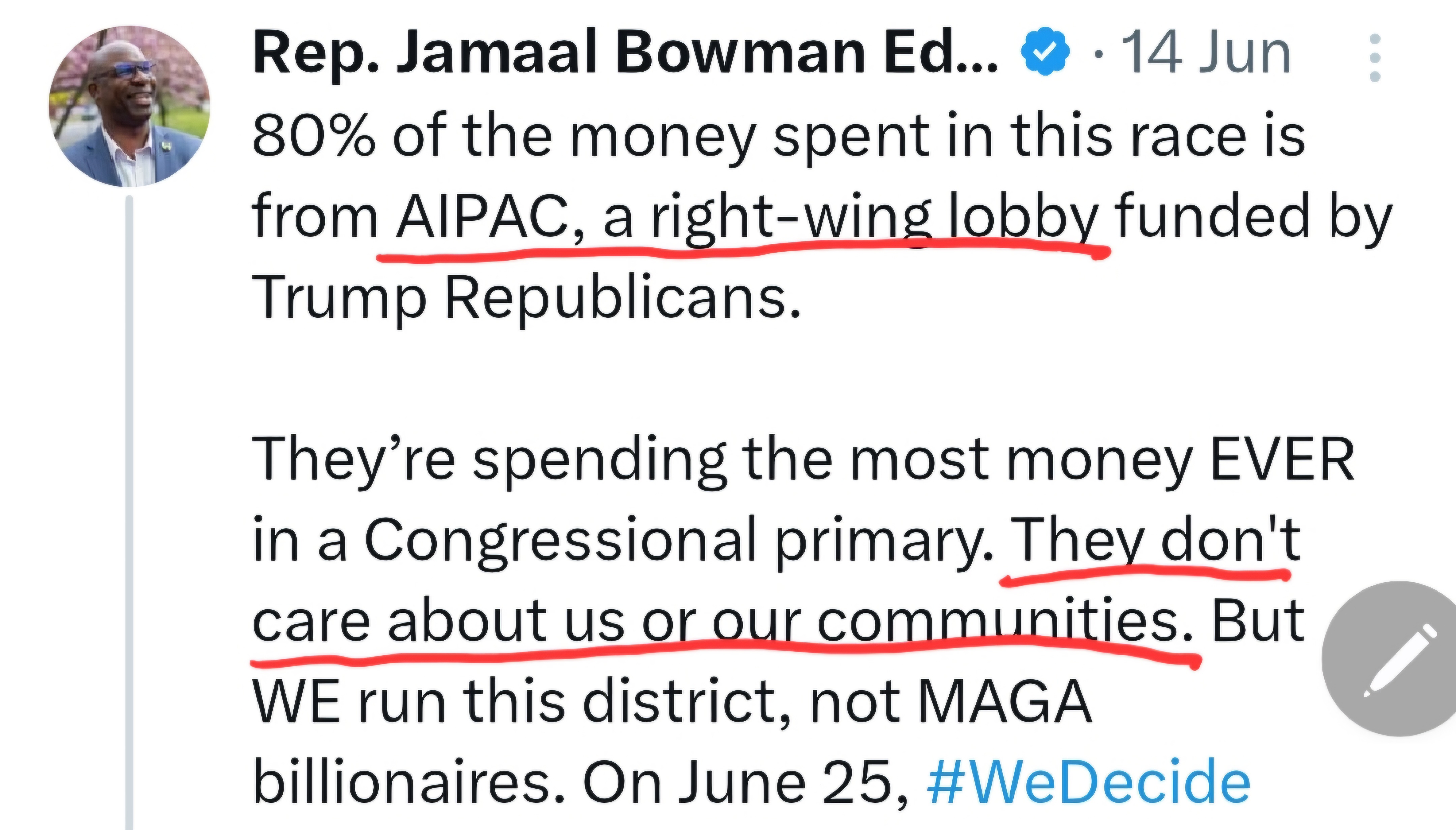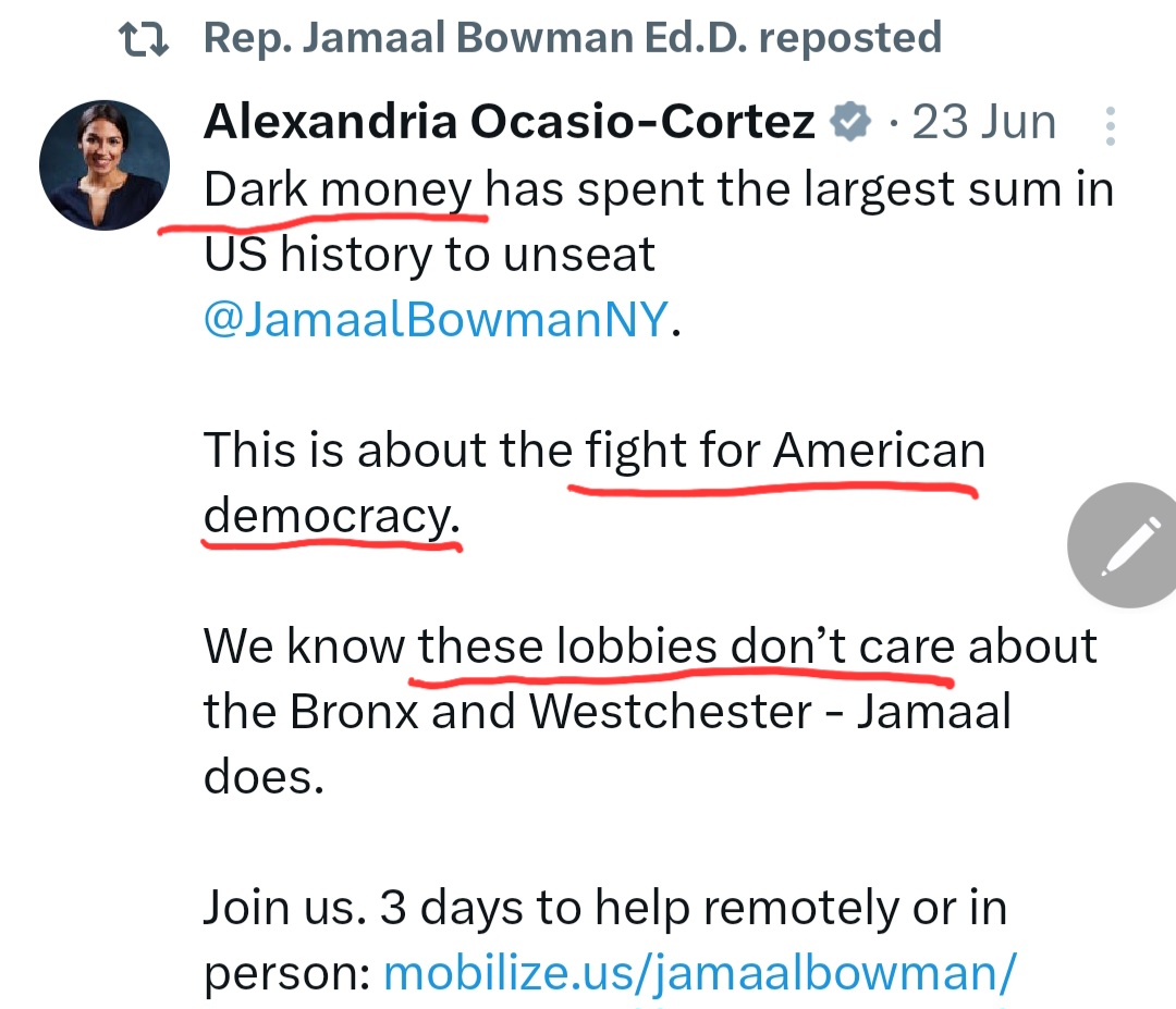 “Dark money has spent the largest sum in history to unseat Jamaal Bowman… these lobbies don’t care about the Bronx and Westchester.”