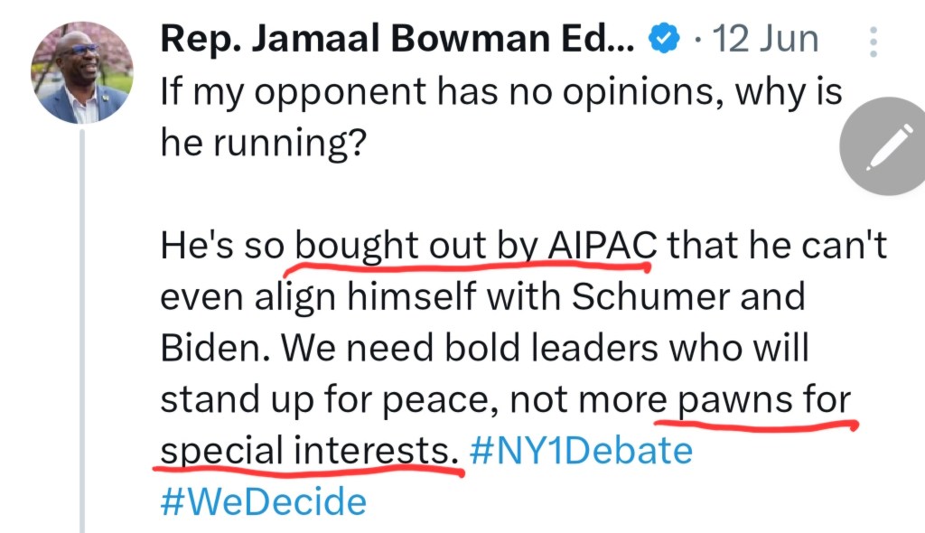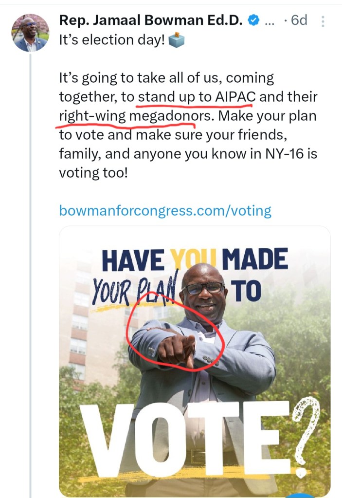 Bowman loved the narrative, and used antisemitic language that AIPAC was “dark money” and were a bunch of “baby killers” in lines lifted from medieval blood libels (see concession speech 3:00 as an example).