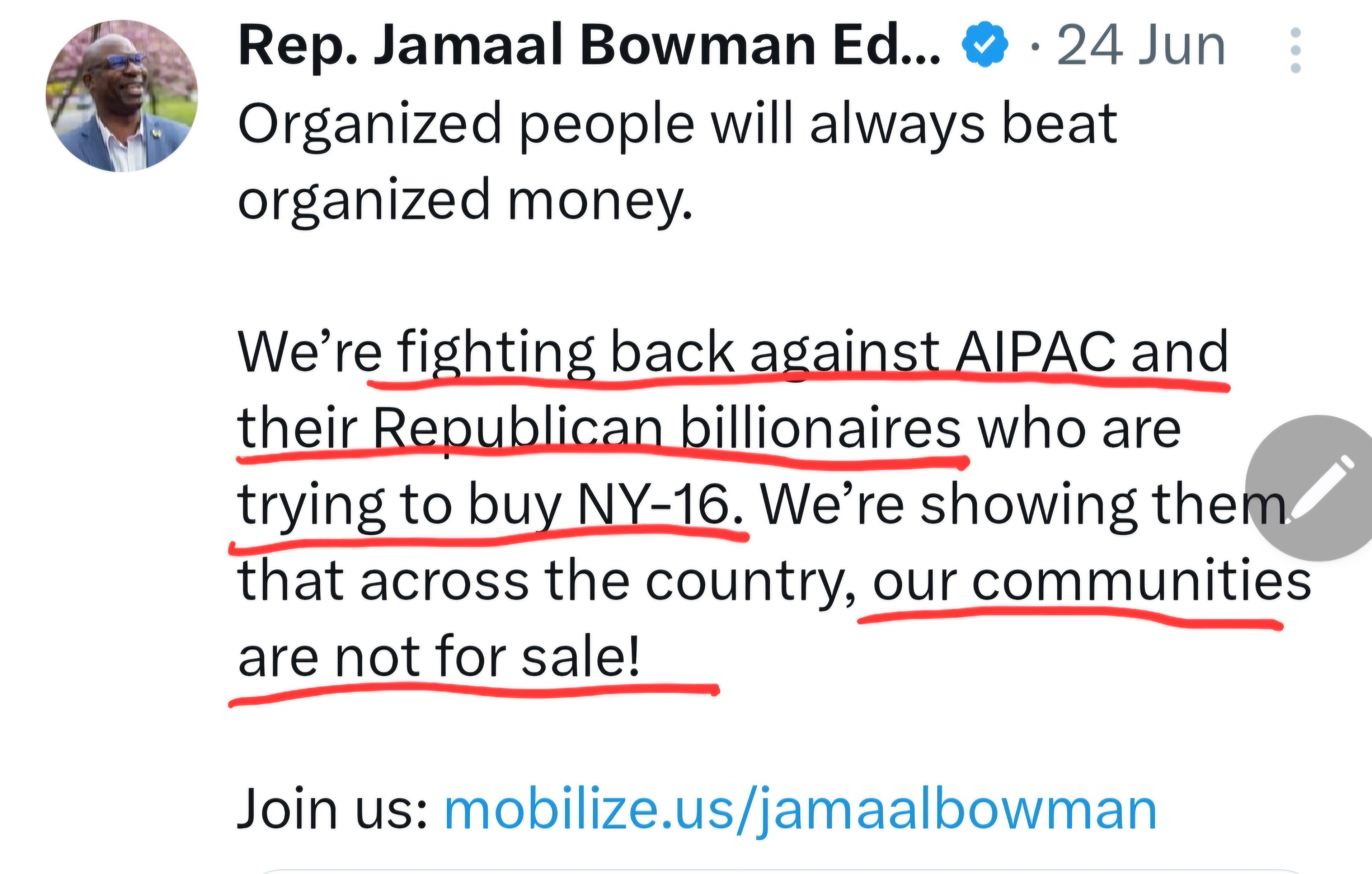 “We’re fighting against AIPAC and their Republican billionaires… trying to buy NY-16… our communities are not for sale.”