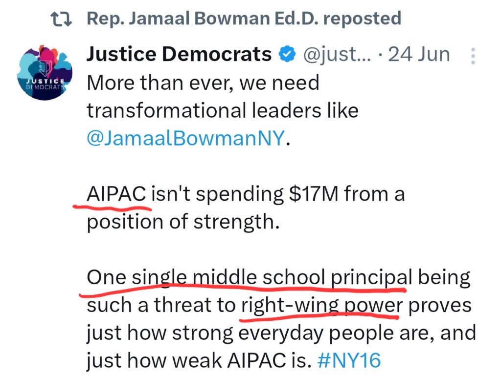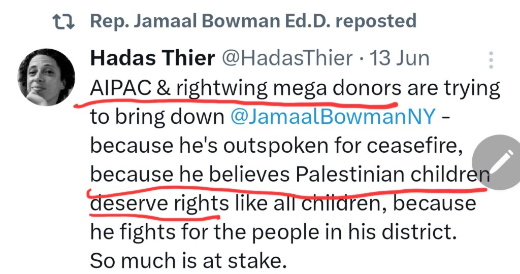 Bowman retweeted “Thanks to funding from right-wing billionaires, AIPAC is targeting progressives of color”