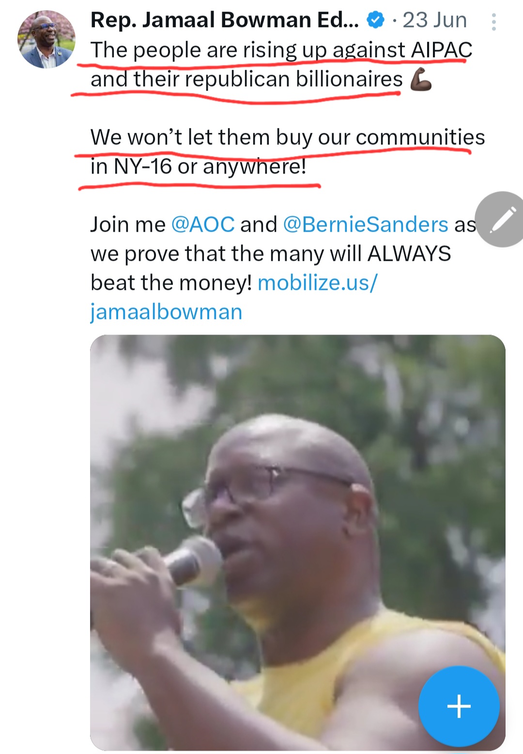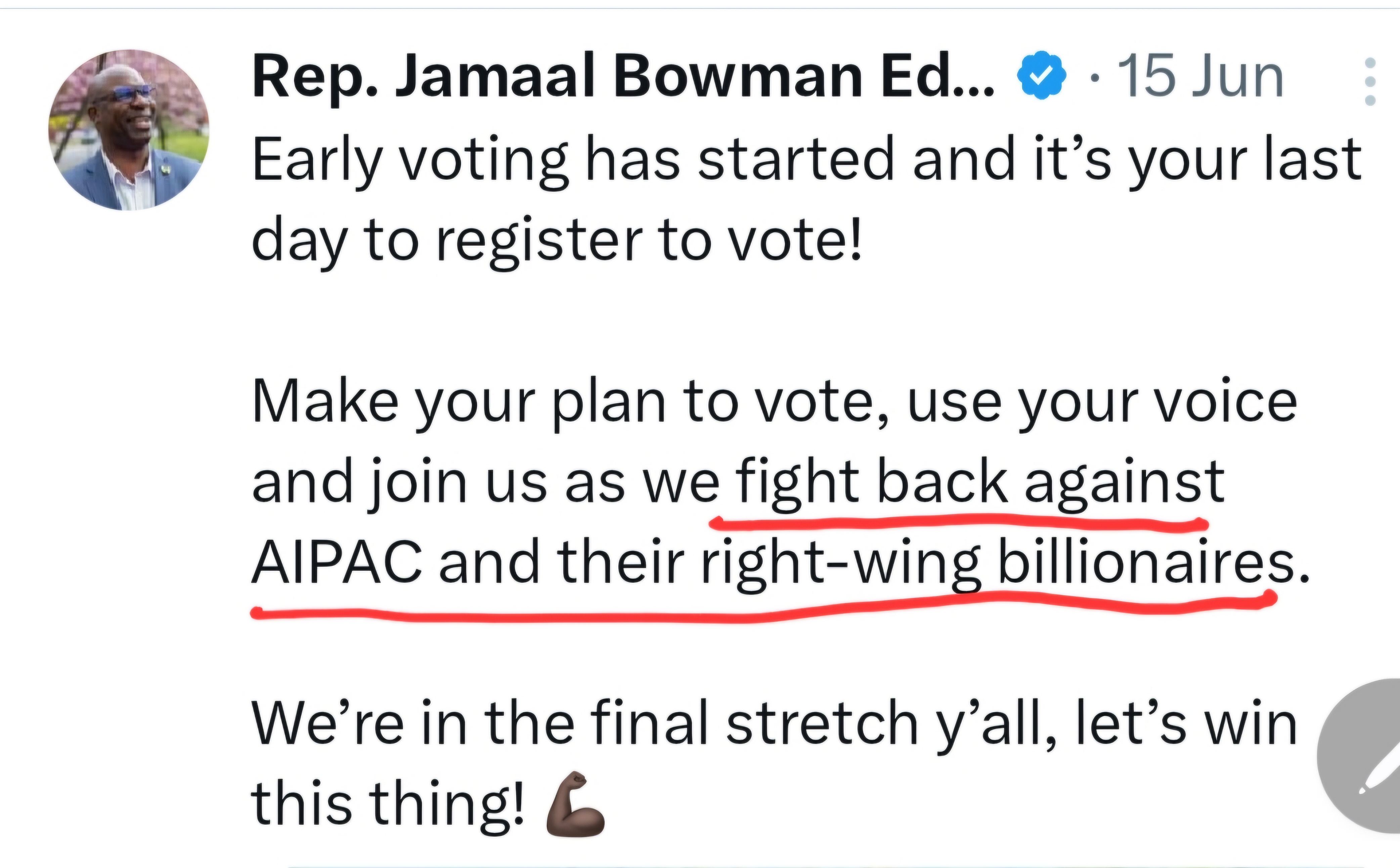 “AIPAC has already spent $6 million against us. Why? because we stand for peace and justice! MAGA Republicans are trying to buy NY-16… we decide the future of our district, not them.”
