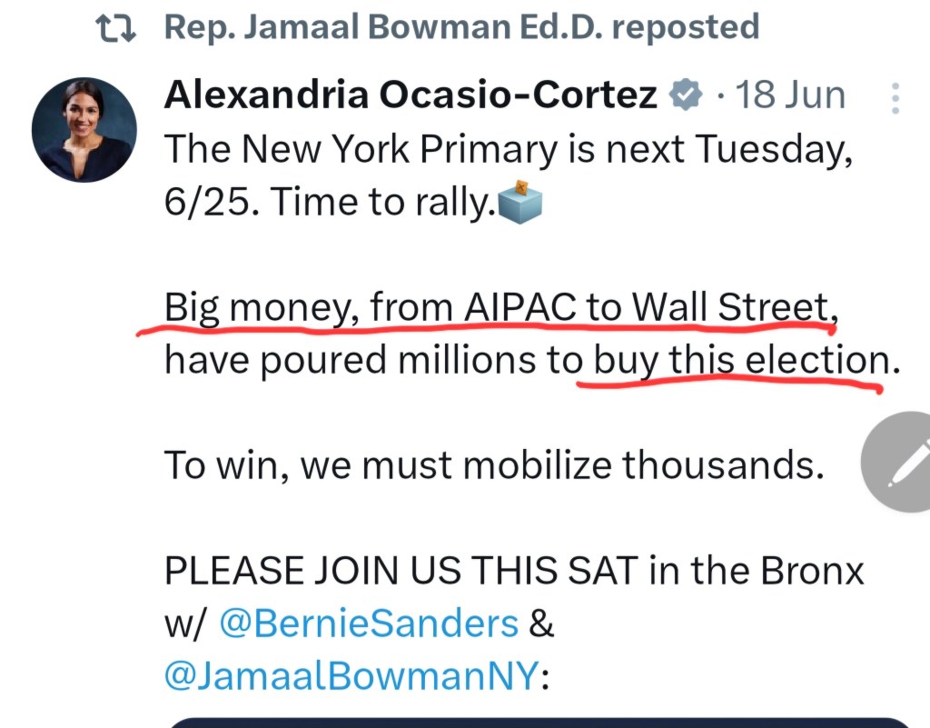 AOC wrote “Big money, from AIPAC to Wall Street have poured millions to buy this election.”