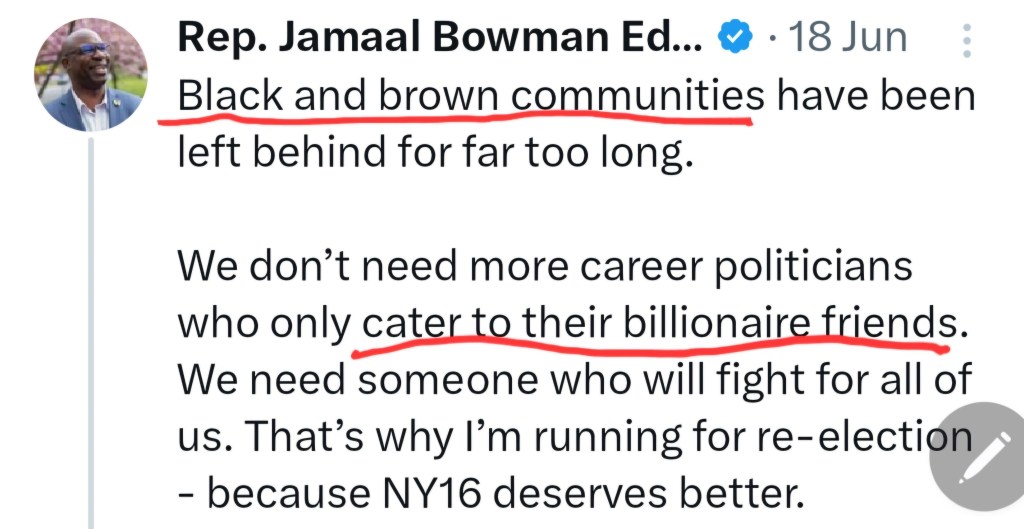 Bowman framed the primary race of two progressives, one Black who is extremist and anti-Israel, and the other White and pro-Israel, as an existential battle between peace-loving working class minorities against evil nefarious forces. It’s appalling and ridiculous as Latimer has decades of strong relationships and dozens of endorsements from Black and Brown politicians, and AIPAC is focused on Israel, not local race relations.