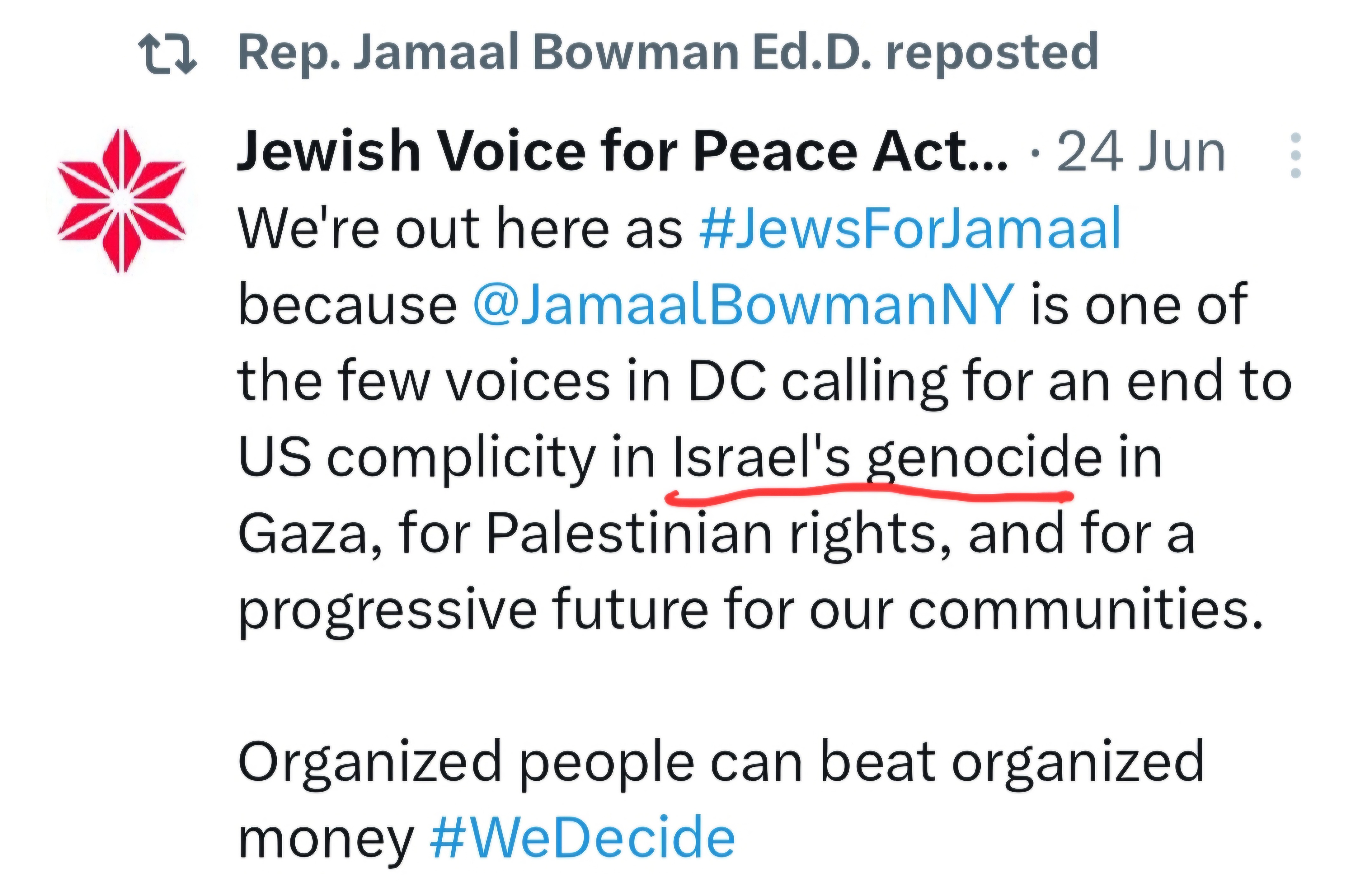 Bowman and friends made clear that these wealthy racists are genocidal, coming for Black and Brown people in the U.S. and Israel.
